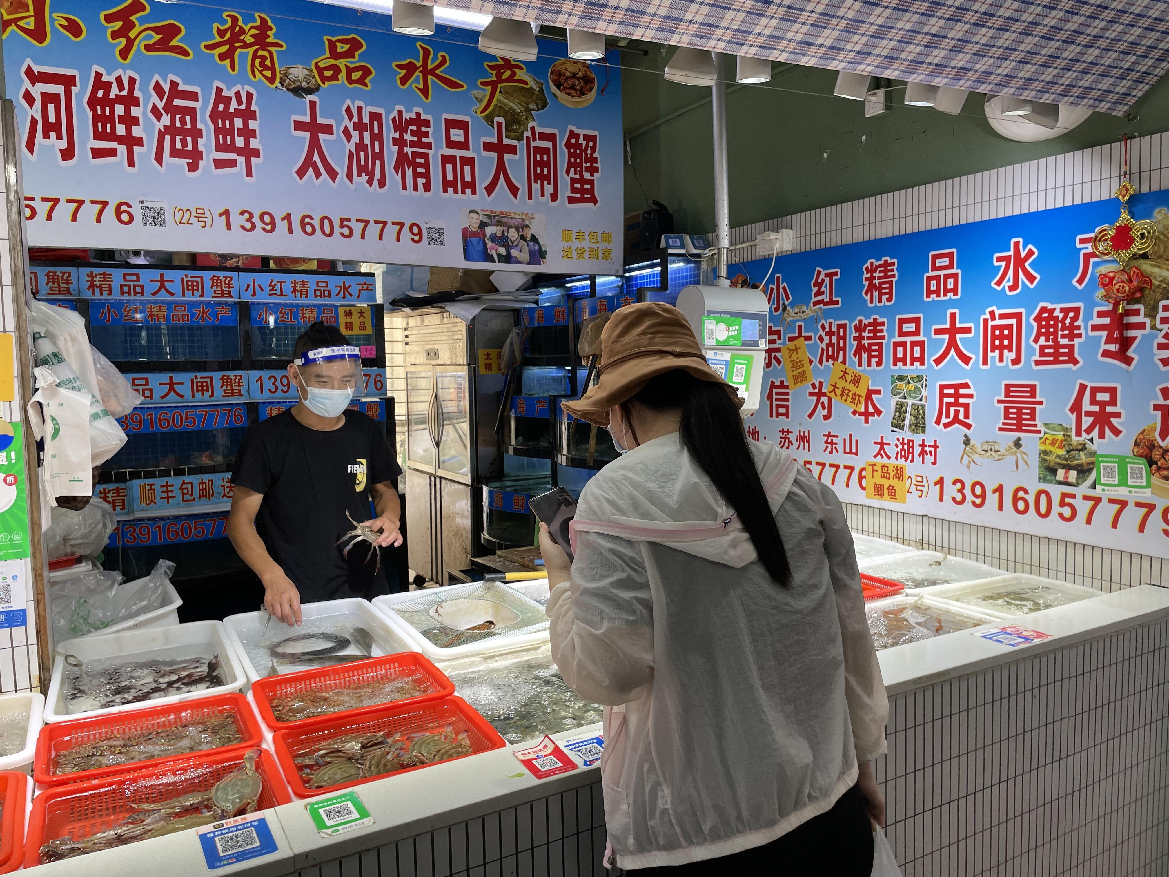 在另一家售卖冷冻梭子蟹的摊位前,6两梭子蟹的售价在35元/斤。正在选蟹的李老伯表示,“相比活蟹,这个冰鲜的口感虽然略差,但性价比更高。买回家作葱姜爆炒,或者自制蟹糊,都是不错的选择。”
