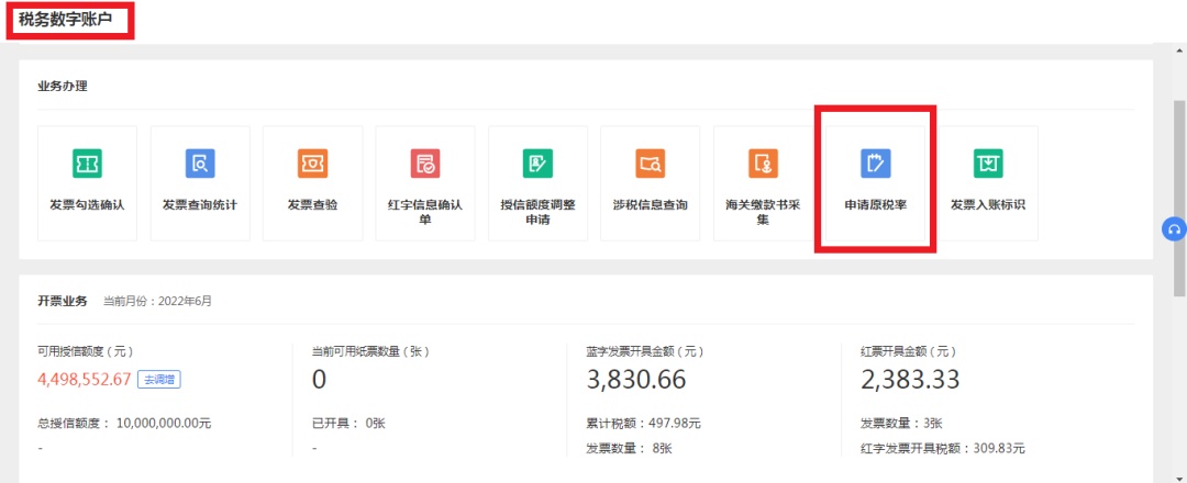 进入【申请原税率】页面。功能菜单依次选择【税务数字账户】-【申请原税率】进入统一页面;或在搜索栏输入【申请原税率】,可快速查找到。