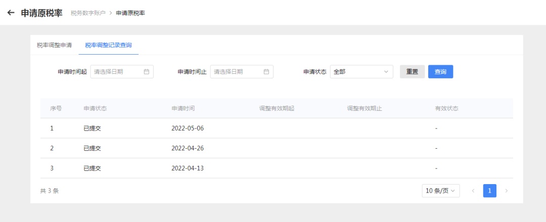 【税率调整记录查询】可以查询到过往提交的调整申请,可以输入查询条件查询对应的记录。