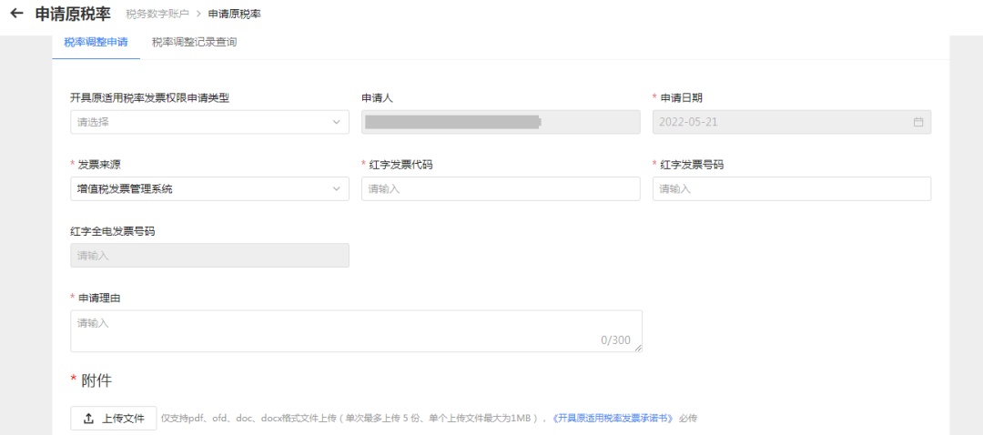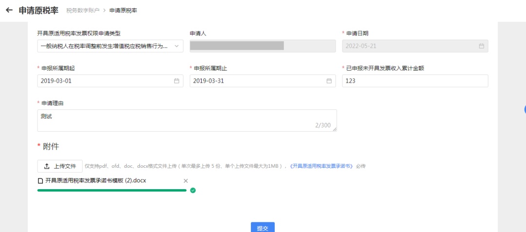 选择开具原适用税率发票权限申请类型等条件,输入条件和申请理由,录入附件后,点击【提交】按钮。