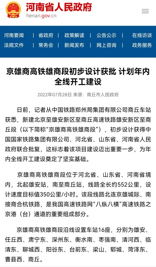 从消息来源看,河南省人民政府网站上这则消息最初来源是商丘市人民政府。消息指出,京雄商高铁雄商段位于河北省、山东省、河南省境内,北起雄安站,南至商丘站,线路全长约552公里,设计速度目标值350公里/小时。
