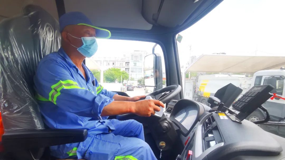 同样为新能源环卫车点赞的还有环卫工人。“新车采用了无级变速,操作便利性大大提高。”净达公司环卫工人峰伟云这两天驾驶了新车,感觉轻松了不少。以往需要控制操控杆进行垃圾装运作业,现在可以一键自动完成。“这个遥控器上有提桶、卸桶、压缩循环等8个作业模式,动动手指,轻轻一按即可完成。”峰伟云表示。