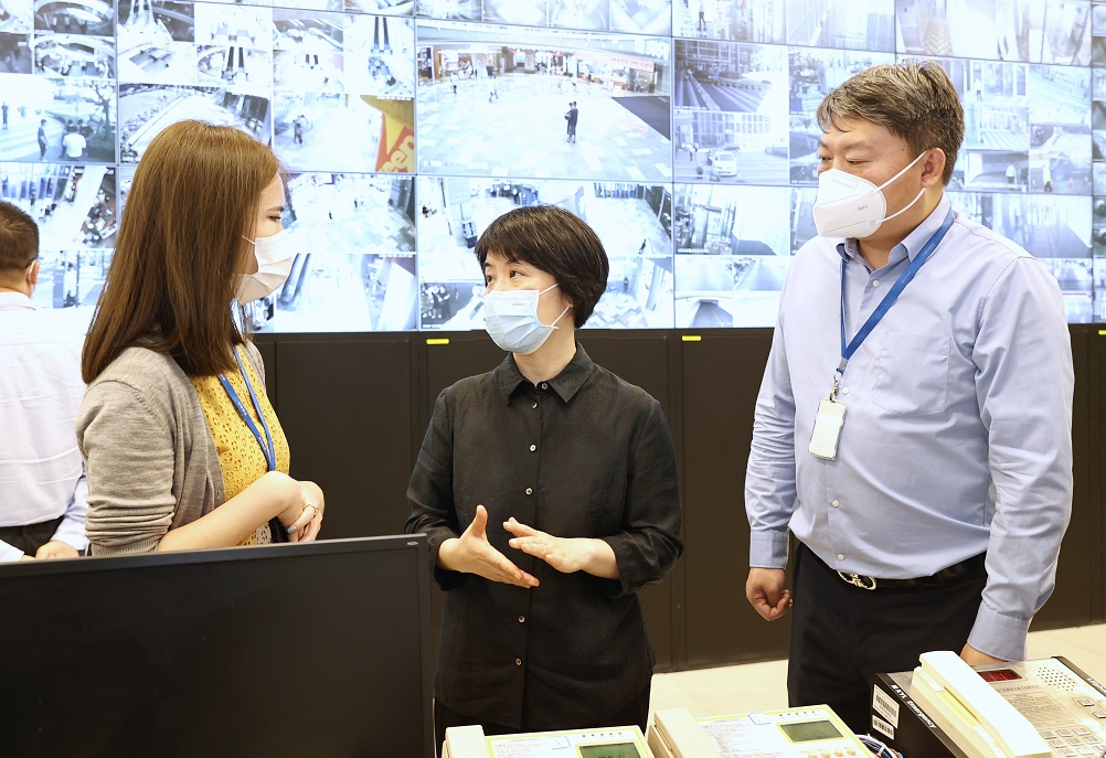 郭芳一边察看商业业态、文化展示、人流情况等,一边听取相关情况汇报,并通过监控室大屏幕查看了商铺经营、扫码入场、周边道路交通等实时画面,仔细询问疫情防控举措、员工健康管理、应急措施预案等落实情况。