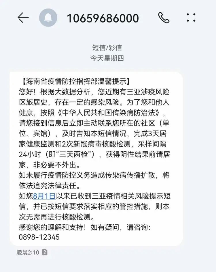 而坐上返程飞机后也并不意味着结束。在今天凌晨2点多,莉莉已经收到了来自海南省疫情防控指挥部发送的温馨提示,因为近期有三亚涉疫风险区旅居史,回到家后要向所在社区进行报备,完成3天居家健康监测和2次核酸检测,期间非必要不外出。