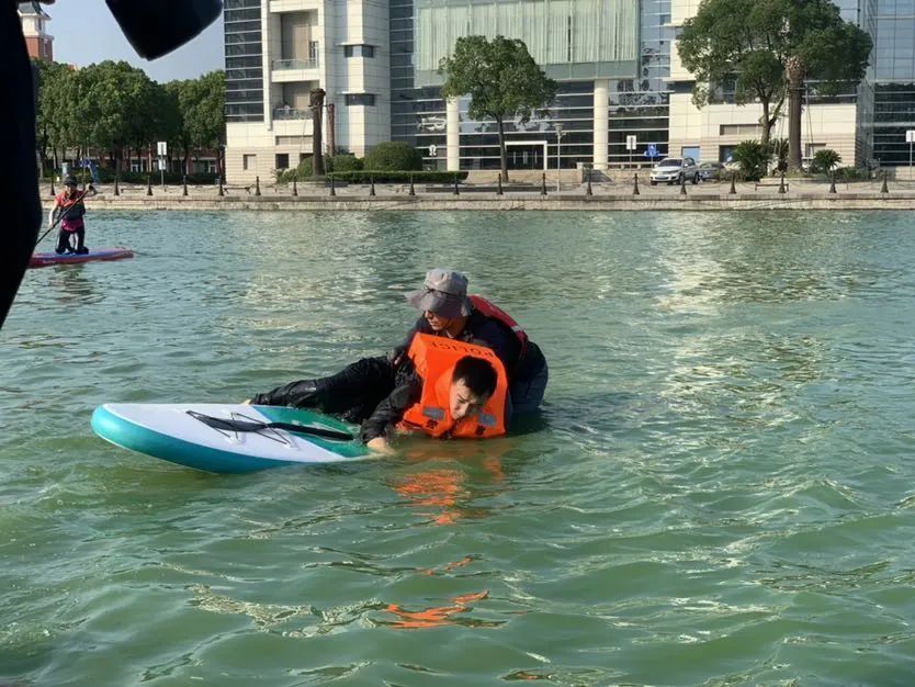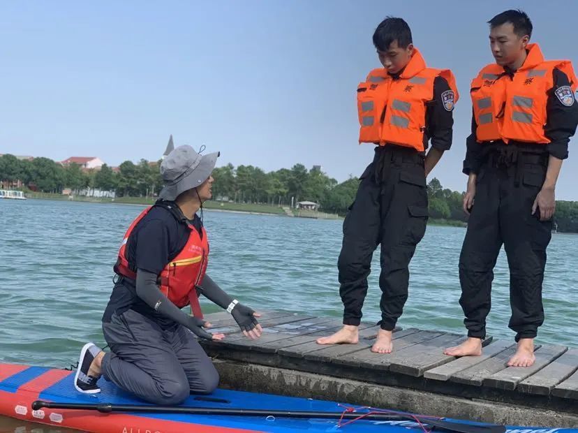 桨板运动的国家级教练刘元柱为特警队员传授如何利用桨板救援溺水者的动作要领,并亲自下水为特警队员演示如何救人,然后让特警队员一个个模拟操作。刘教练说:“充气救援艇相对体积大一些,能让我们比较平稳地去进行救援。但万一施救者溺水很严重,失去了自我意识,我们就很难把施救者拖上艇了。”在刘教练的认真教授下,特警队员全身心投入,逐步掌握了桨板救援的动作要领。