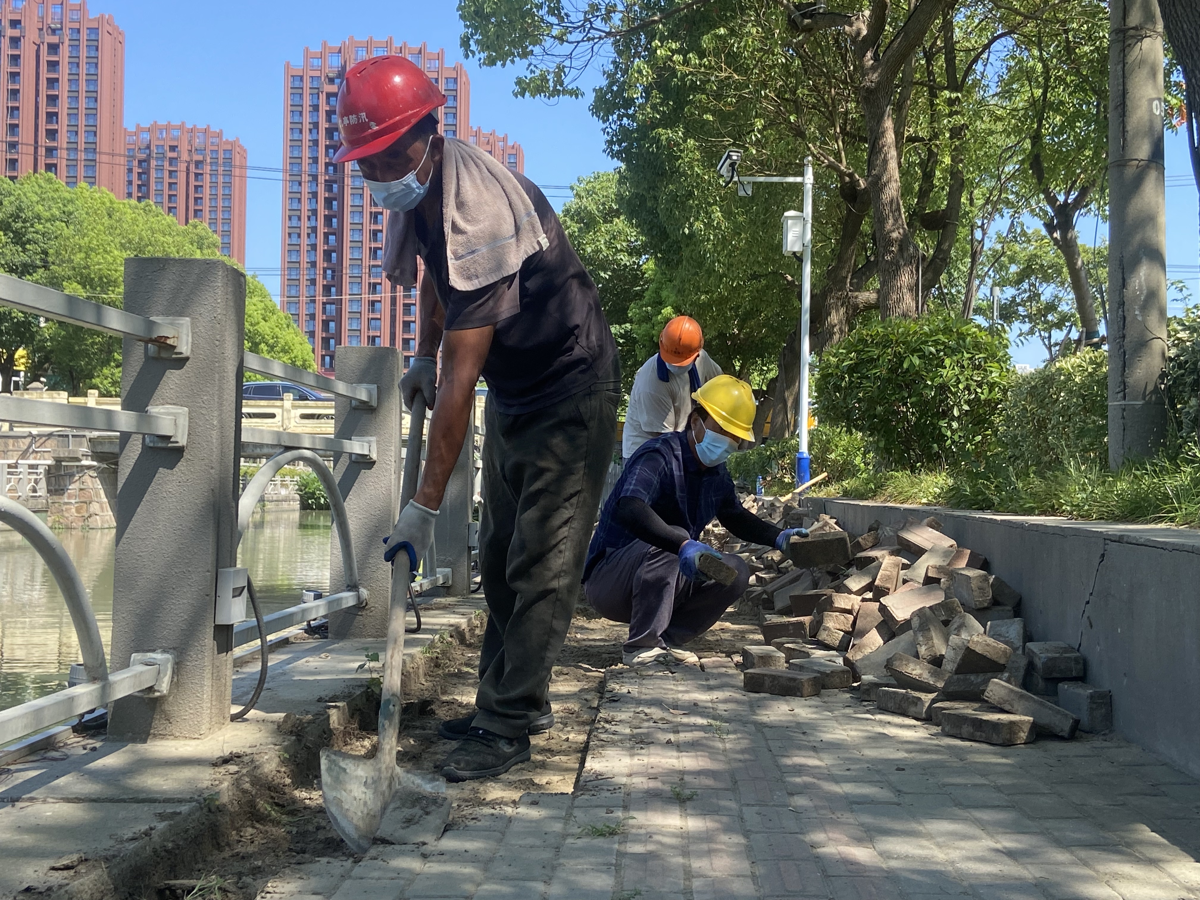 据悉,康平路河段提升工程此前已纳入今年九亭镇工作计划,由于疫情工程进度延迟。该工程已于8月1日恢复施工,原有地砖清除后,将铺设彩色沥青步道。九亭镇河长办工作人员介绍,相比原来的地砖,沥青步道不易出现沉降和坑洼,且更有弹性,居民行走或运动时会更加舒适。整个工程预计8月底完工,届时将为附近居民提供集健身休闲于一体的绿色空间。