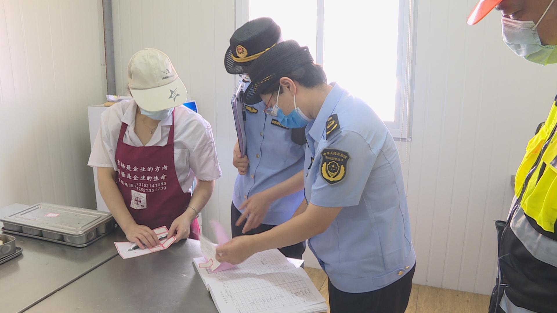今天上午,记者跟随奉浦市场监督管理所来到辖区内的一处工地食堂进行专项检查,重点检查索证索票、食品留样、经营场所环境卫生等环节。