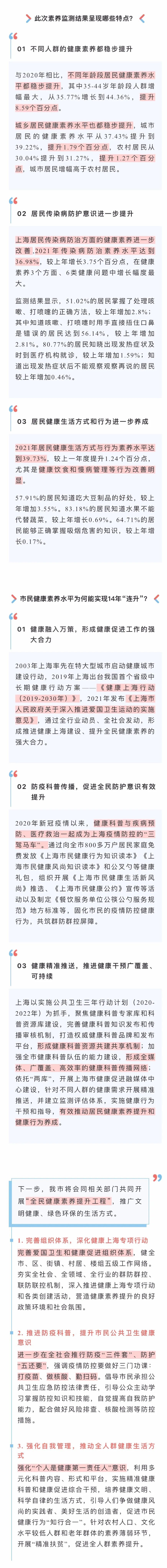 市卫健委日前发布2021年上海市居民健康素养监测工作情况。统计显示,去年上海居民健康素养水平达到38.25%,并实现14年“连升”,提前达到上海市卫生健康发展“十四五”规划的目标。详见↓