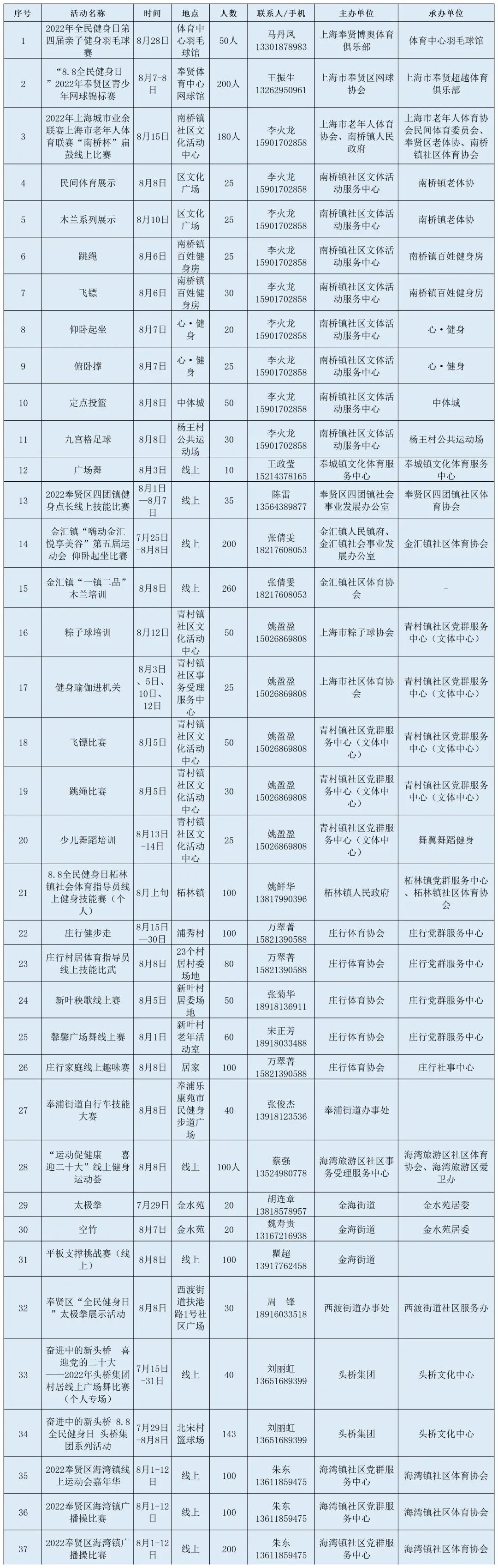 今年的8月8日是我国第14个“全民健身日”,新修订的《体育法》规定,每年8月8日全民健身日所在周为体育宣传周。为进一步推动全民健身国家战略实施,助力南上海运动健康新城建设,促进全民健身与全民健康深度融合,区体育局即将开展丰富多彩的全民健身活动,邀您共同参与!