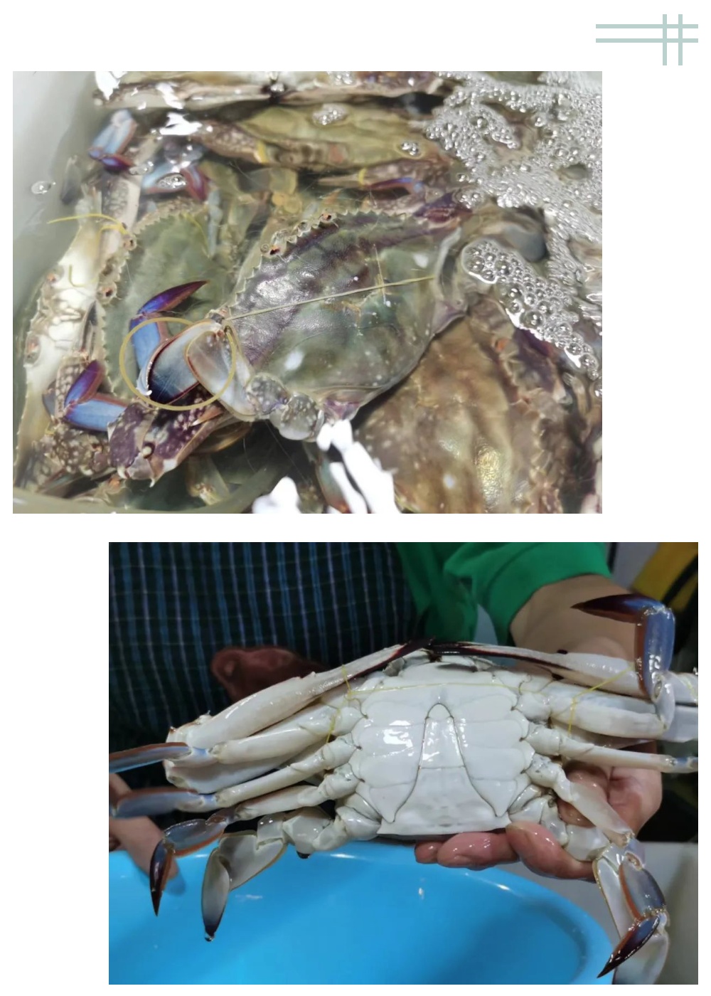 04、看蟹足。蟹足和躯体连接紧密,提起蟹体时蟹足坚硬,不松弛下垂的最肥美。