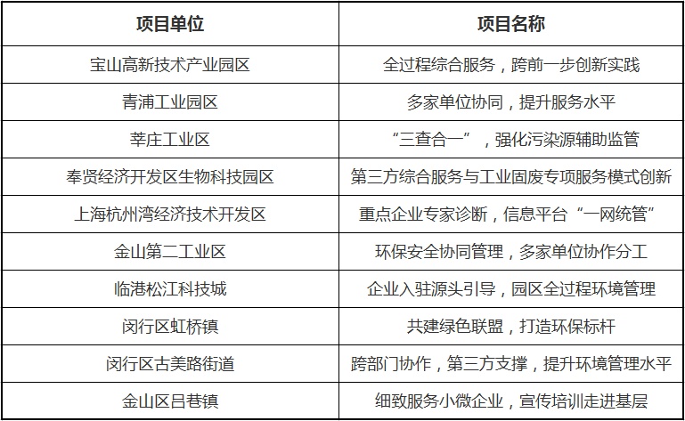 为贯彻落实市委、市政府《关于加快构建现代环境治理体系的实施意见》,积极探索第三方环保服务模式和政策机制创新,进一步推动完善环境治理市场机制,根据市生态环境局《关于组织开展第三方环保服务试点示范工作的通知》(沪环科〔2020〕228号)要求,经各区推荐申报,现场调研和专家评审,确定宝山高新技术产业园区等10个园区街镇委托的服务项目作为本市首批第三方环保服务示范项目,现将名单予以公布。