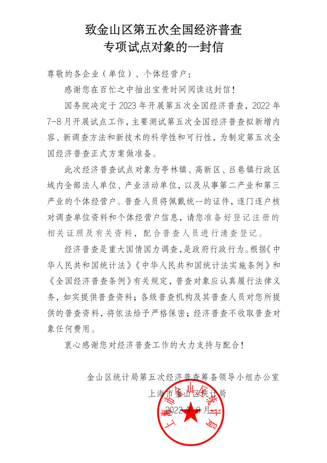 按照国家统计局部署,今年6到9月在全国范围内组织开展“五经普”专项试点,金山区、浦东新区、松江区是上海市的三个试点区,金山区将在亭林镇、高新区和吕巷镇三个地区开展试点工作。