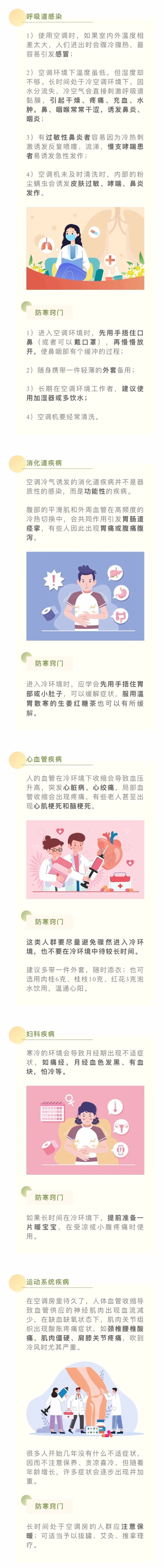 近日持续高温,大家使用冷空调的时间相应延长。市健康促进中心提示,因夏季使用冷空调诱发疾病的现象慢慢多了起来,被称为“空调病”。一起来看呼吸道感染、消化道疾病等5种常见的“空调病”症状及防寒应对方法↓