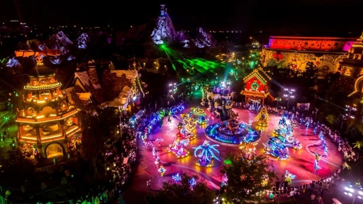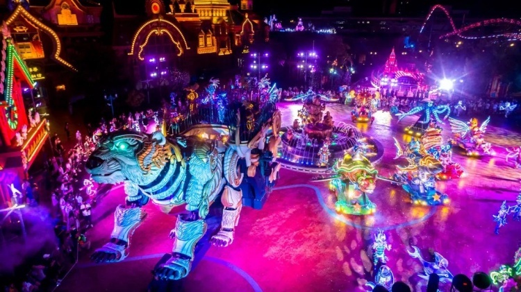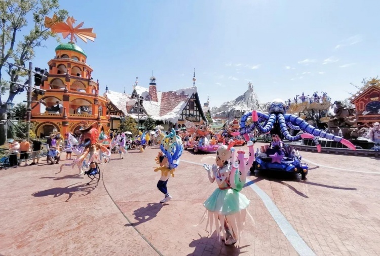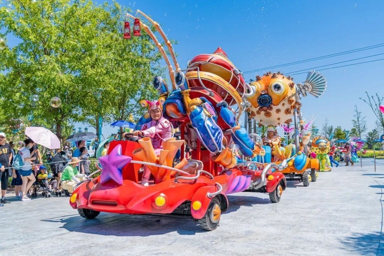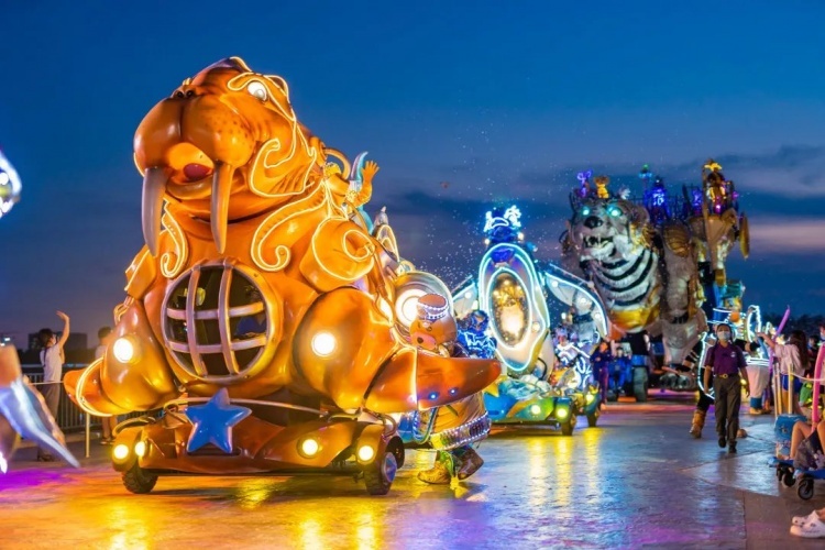 在海灵与Winters的带领下,包括超10米的水下仿生鲸鲨机甲在内的十余种海洋动物化身的机甲行进环绕于园内冰雪王国主题区内,通过原创海洋故事剧情与园内环境建筑的互相融合,利用视频投影,激光渲染、实景特效等演艺技术,融合舞蹈、杂技等表演形式,打造出这场日夜切换、动静相宜的大型主题巡游。