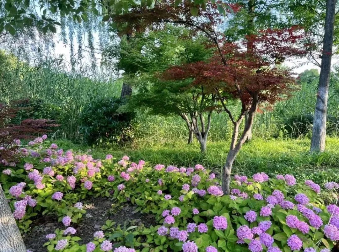 园内以彩林花田、滨水湿地景观为主,行走其间,如同画布上的清浅色调,绿植在向上生长,林间色彩开得浓烈,草坪上的狗子欢脱跳跃,孩子们笑得干净纯粹,一呼一吸,盛夏仿佛都可以无尽蔓延。