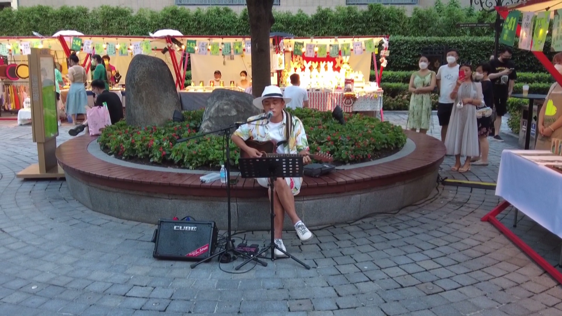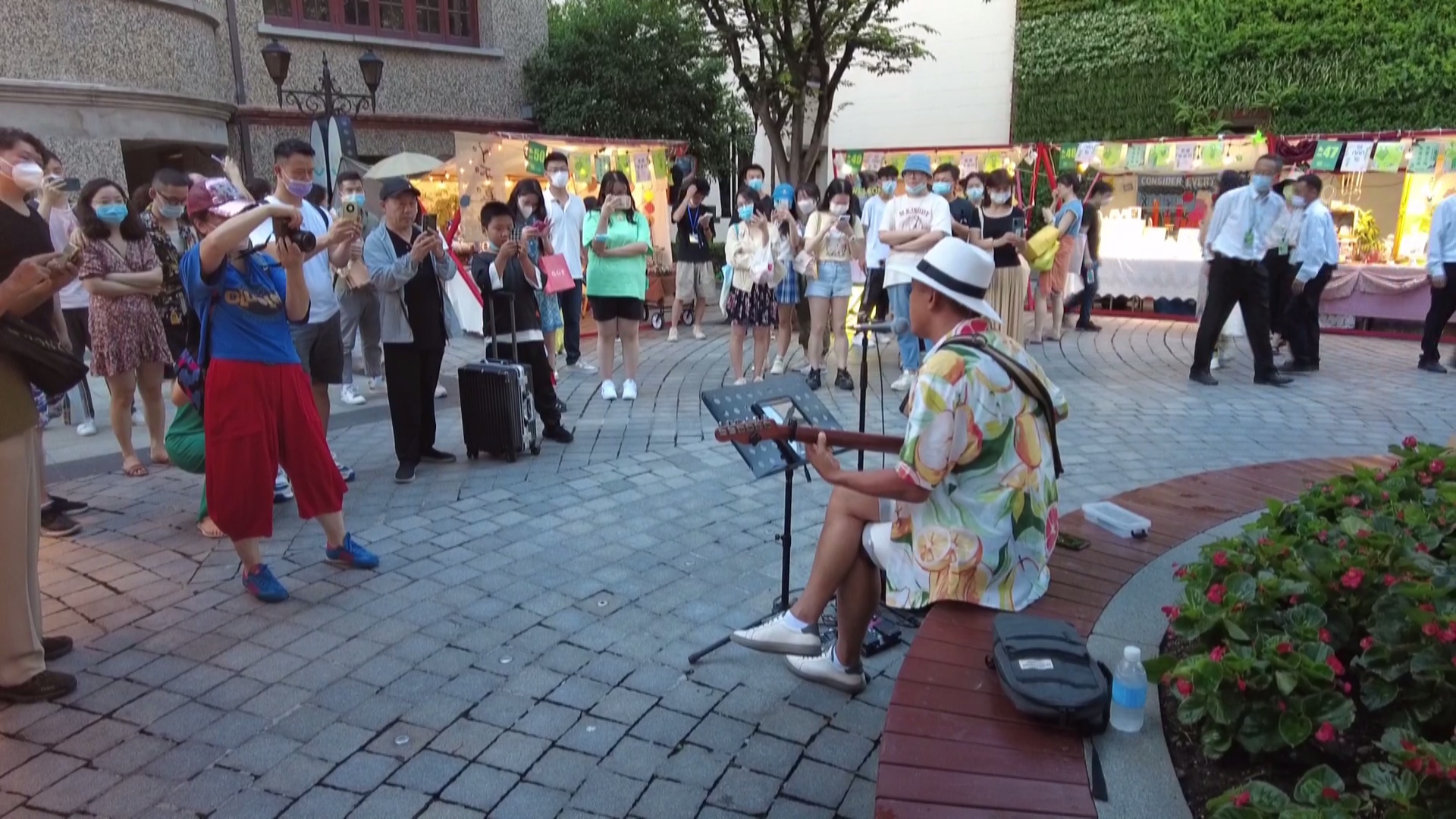 思南小广场,随着吉他的伴奏,歌手悠扬而又柔绵的歌声在空中回荡,顿时吸引了不少市民在这里驻足。李小姐告诉记者,来到这里都很放松,毕竟疫情关在家里很久了。“ 比较适合夏天的傍晚,氛围很好,很惬意。”