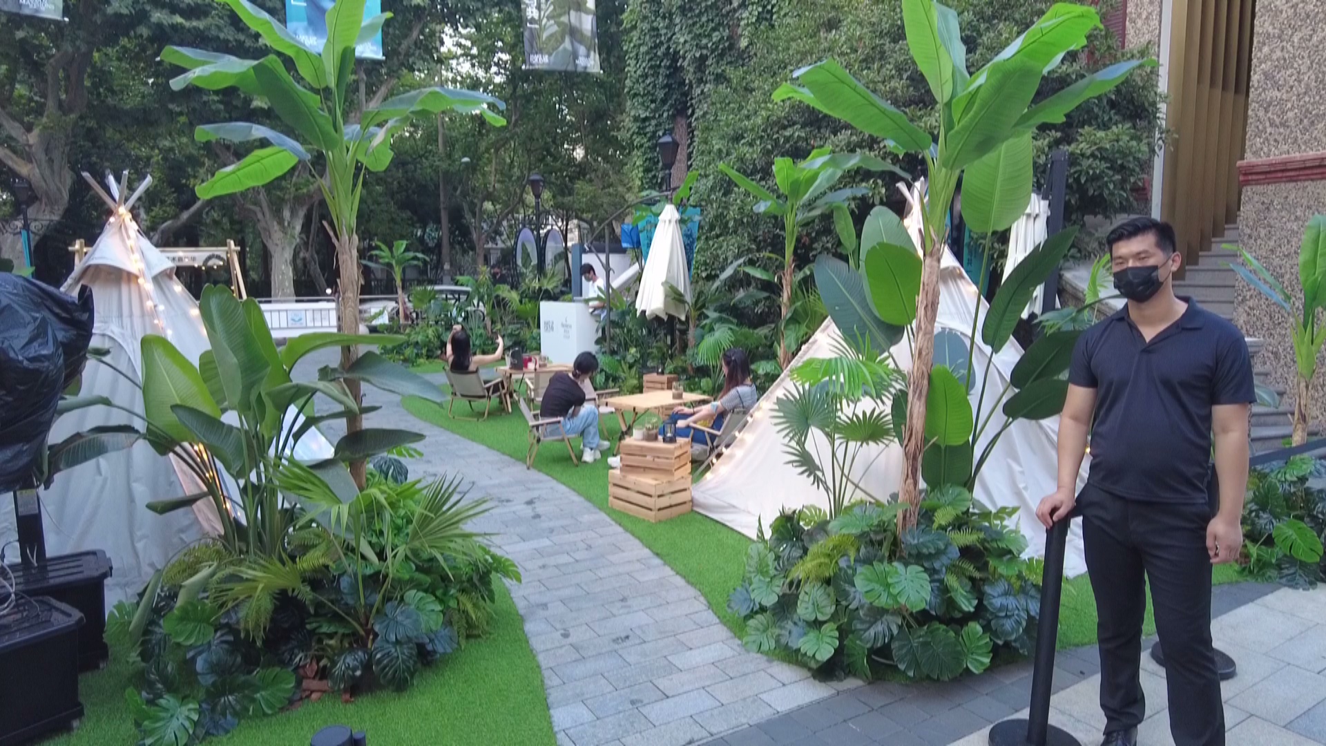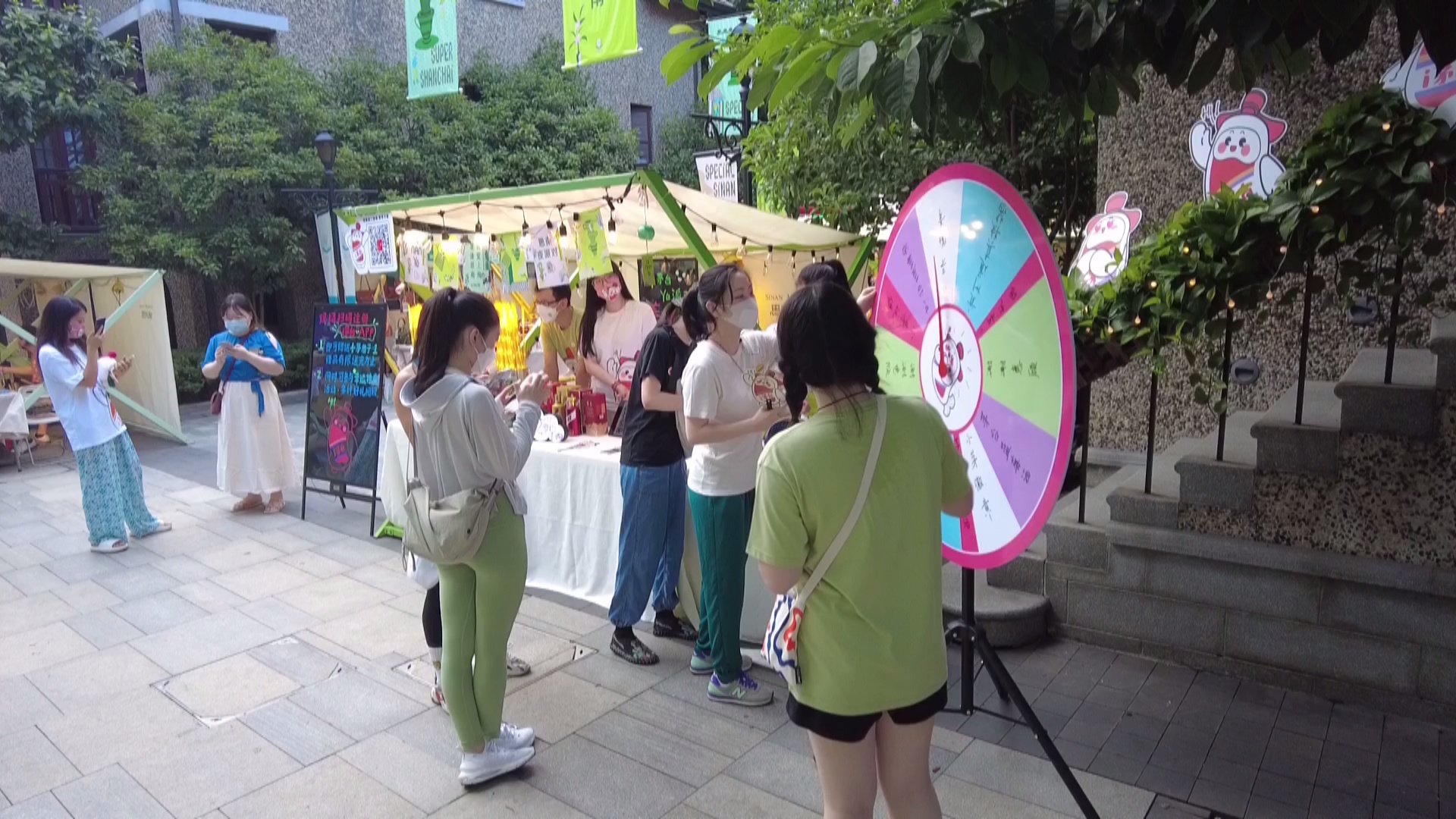 喜爱大自然绚丽风光的市民可以逛逛思南时区的《自然与共艺术摄影展》,通过多维度的视角,与大自然和美妆爱好者共赴这场艺术盛宴。如果还不过瘾,可以与展览的露天野营区,与自然风光场景来个亲密接触,打卡互动。陈小姐告诉记者,这里其实还不错,在闹市中心有这么一块幽静自然之地,加上刚刚下了雨,感觉气温也不是很热。“ 大家可以在这里拍照,休息休息。整个市集里的摊位都挺好,有些摊位,比如说卖咖啡,或者是香薰,或者是有些手工制品等,样子什么的都还不错,感觉都很有特色。”