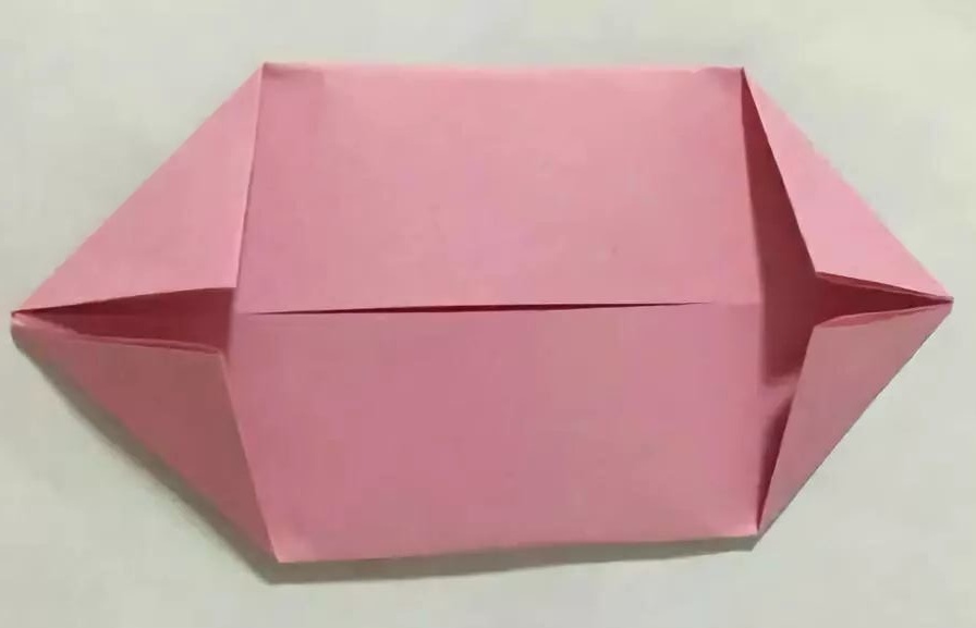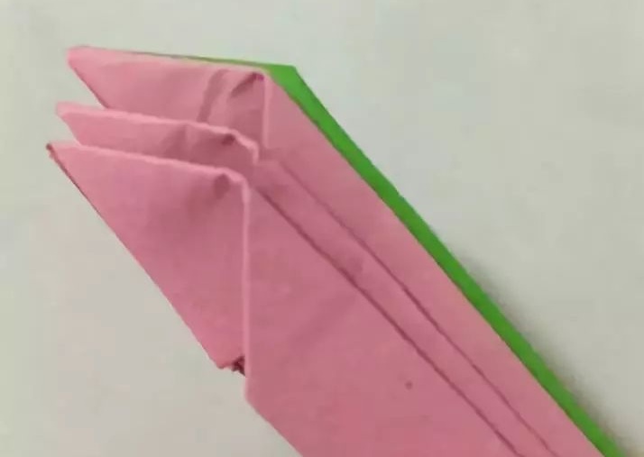 ○ 将绿色纸折的一面向下,把第一层粉色纸折顺序向上弯折