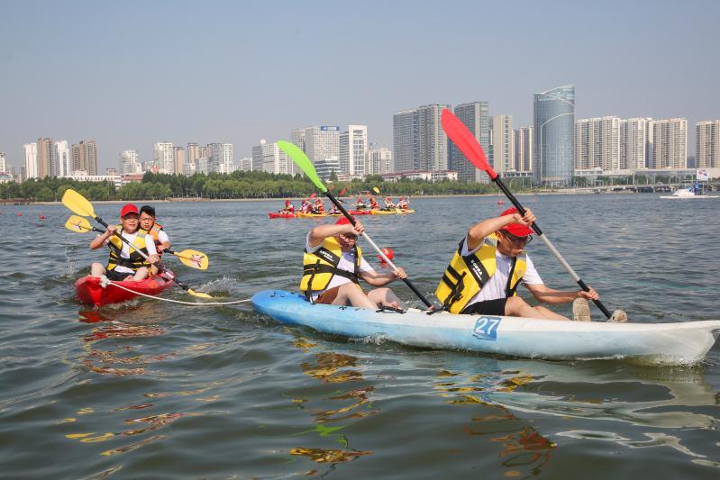8月7日,临沂市2022“划遍沂蒙”皮划艇联赛主题赛事在沂河水上运动中心举行。来自临沂市市场监督管理局等机关单位的100余名队员分别参加了皮划艇接力赛、皮划艇竞速赛等项目角逐,以开展水上运动的方式迎接全国8月8日第14个全民健身日的到来。(大众日报客户端记者 卢鹏 通讯员 许传宝 李宗宪 报道)