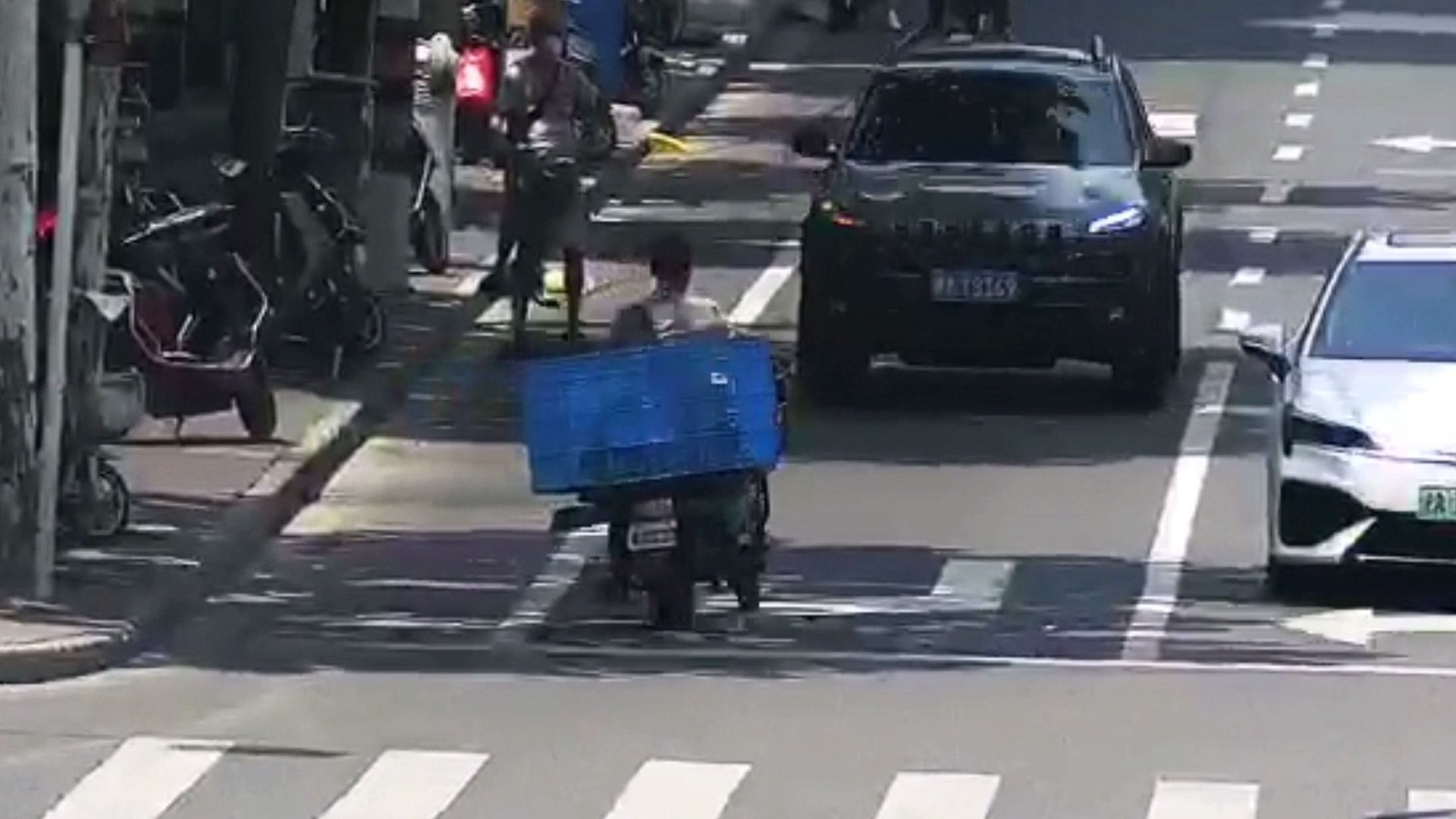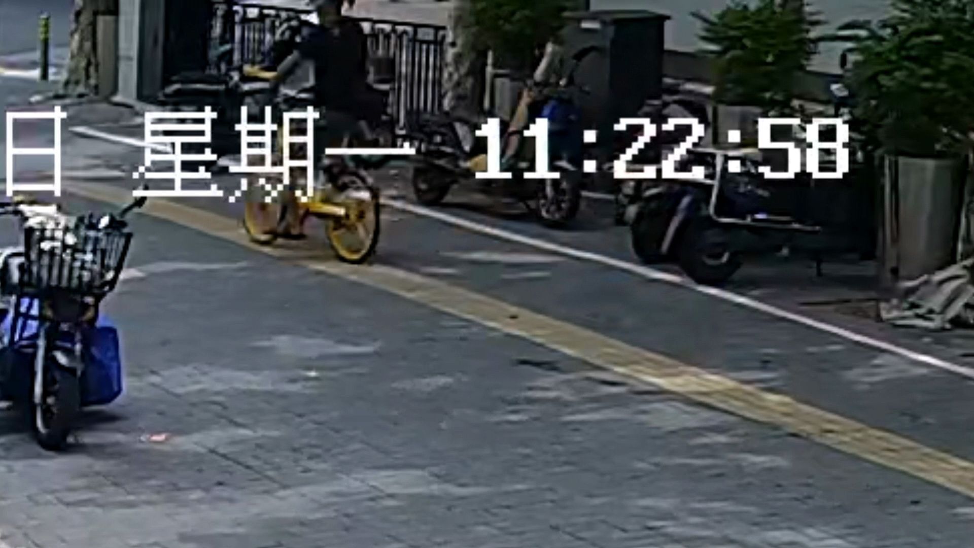 公共视频显示,今年7月18日,嫌疑人孙某在骑共享单车经过中山北路普善路时,发现一辆送快递的电动自行车停放在路边,趁无人之际,迅速将车骑走。