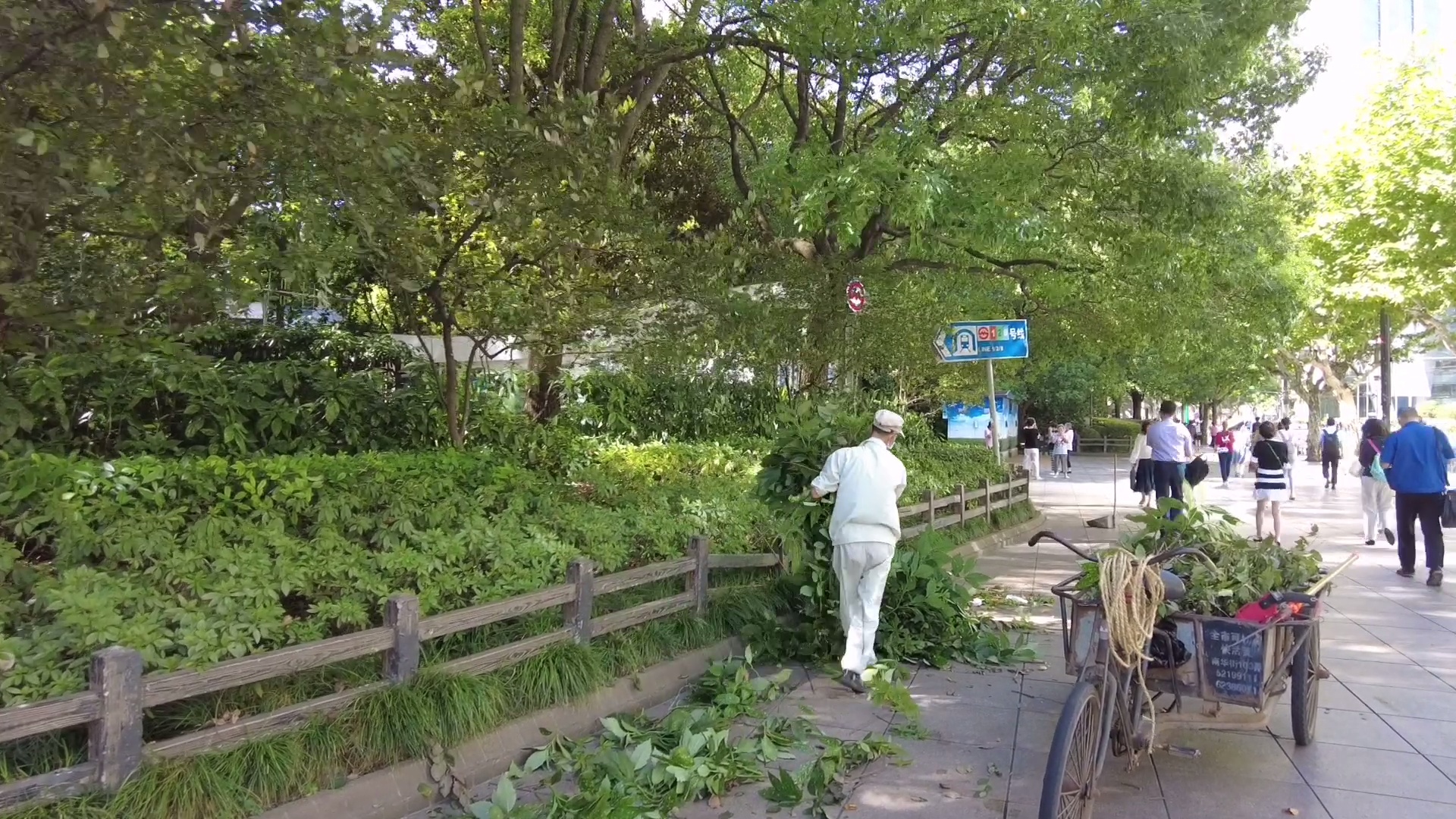 一天的劳作由清晨开始,在人民广场绿地,黄浦区绿化保洁工一早便投入工作,割草、清扫、浇水,草坪犹如刚理了一次发,清爽而透气。而在人民公园,三个师傅正在修剪树枝,一会儿弯腰,一会儿爬高,不一会儿,身着“黄浦绿化”字样的工作服,已经湿透了大半。