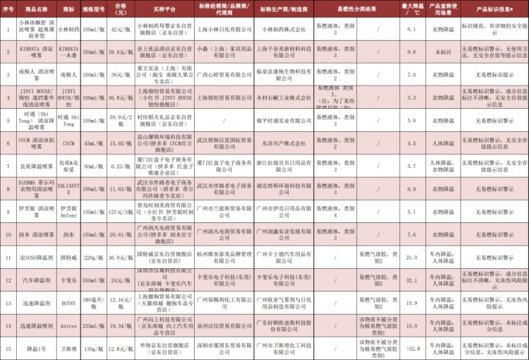 听说最近怕热的小伙伴们出门都用上了降温喷雾。它到底有效吗?安全吗?目前市面上的降温喷雾,分为常压和加压(气雾罐)2种类型,一般宣称用于车内降温、衣物降温或人体降温。市消保委买了20款热销的降温喷雾,从降温效果、易燃性、标识规范性等方面进行评测。详见↓