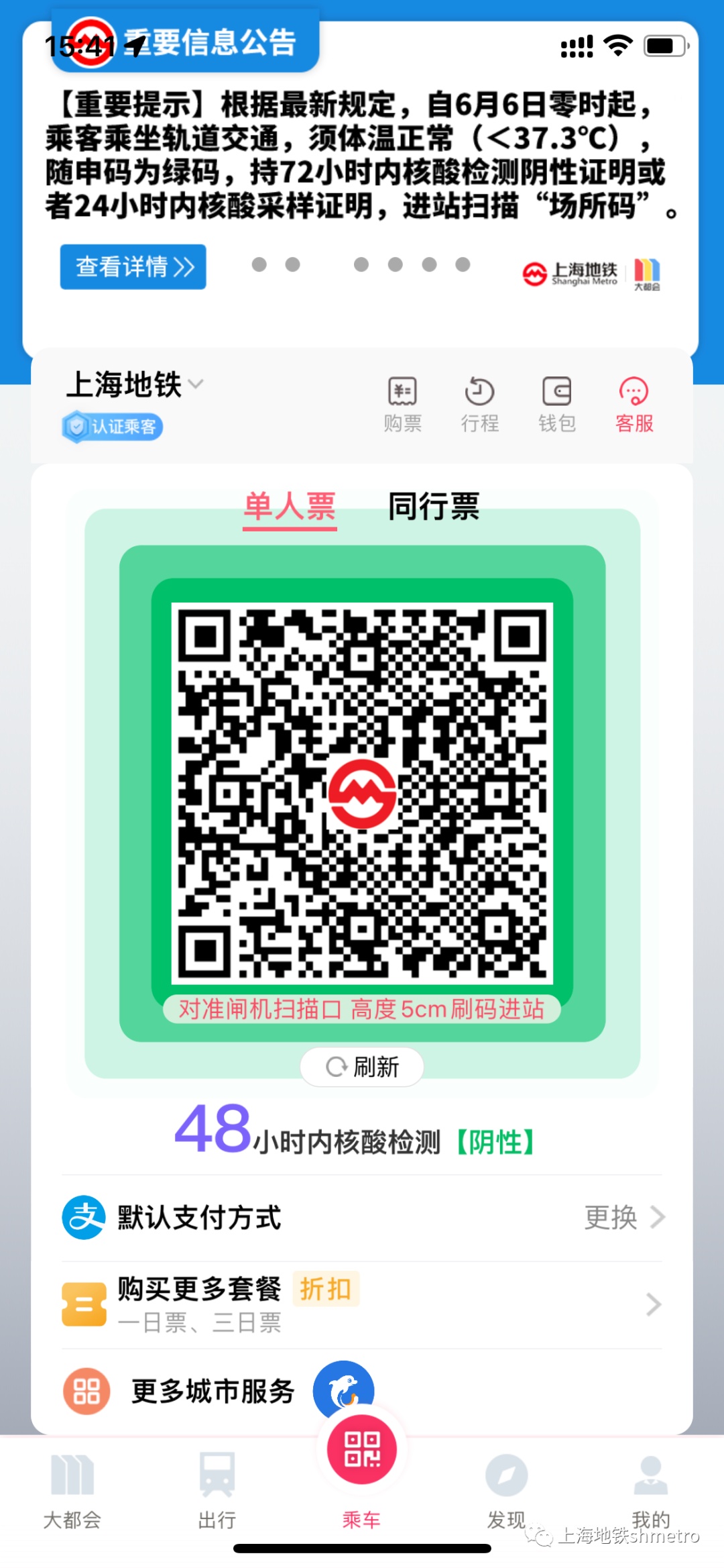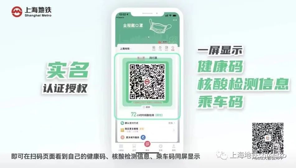 Metro大都会支持“健康码”及“核酸检测”信息展示,用户可凭借乘车页面的绿码状态及72小时内的核酸阴性结果,持码进站,无需再扫“场所码”。