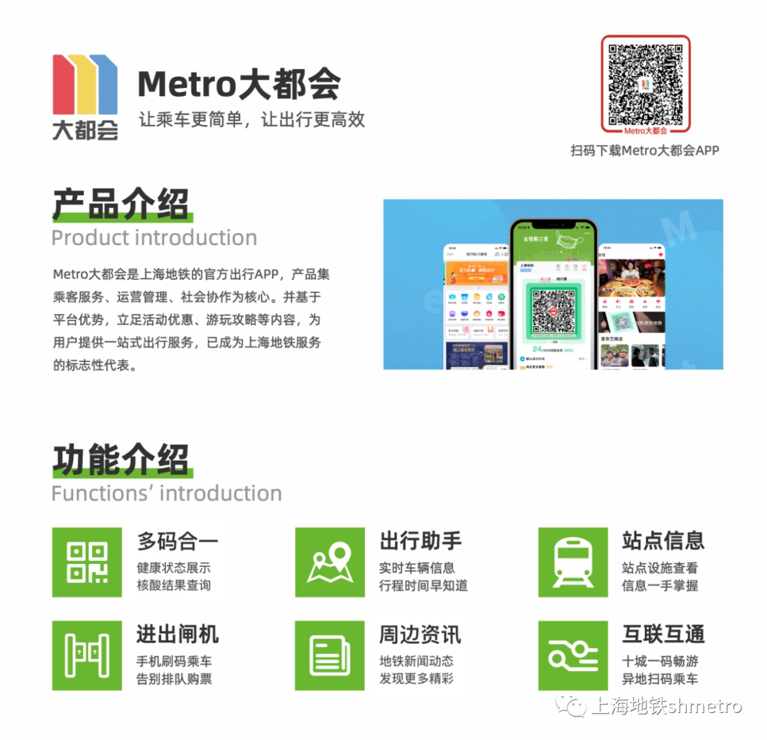 "Metro大都会"是上海地铁的官方出行App, 在功能上,集乘客服务、运营管理、社会协作为核心。并基于移动App的平台特性,在为上海地铁乘客提供进出站服务的同时,立足活动优惠、内容产出、游玩攻略等板块,为用户提供一站式出行服务。