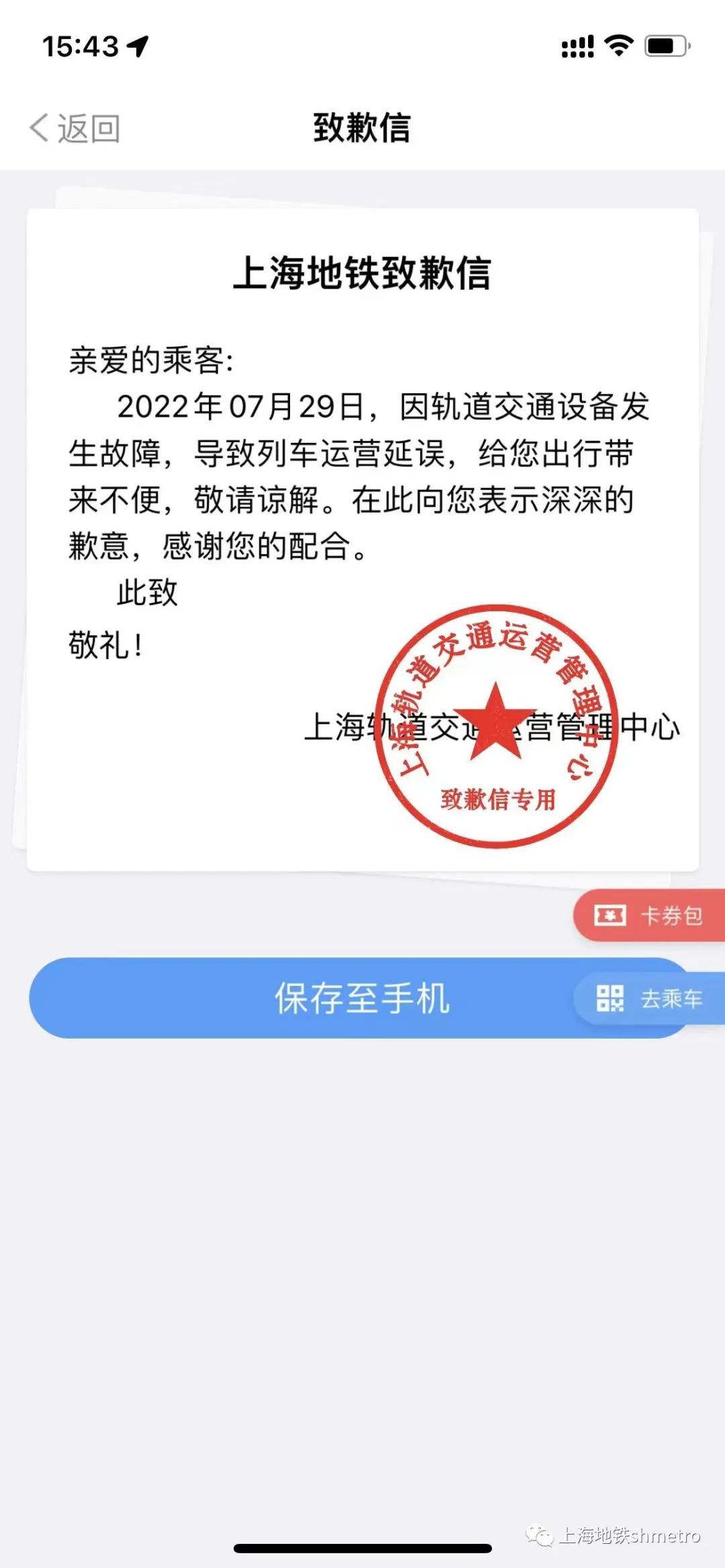 当遇到地铁线路延误,Metro大都会的用户可在App内在线申领致歉信,并下载保存到手机,与线下致歉信具有同等效应,方便更环保。