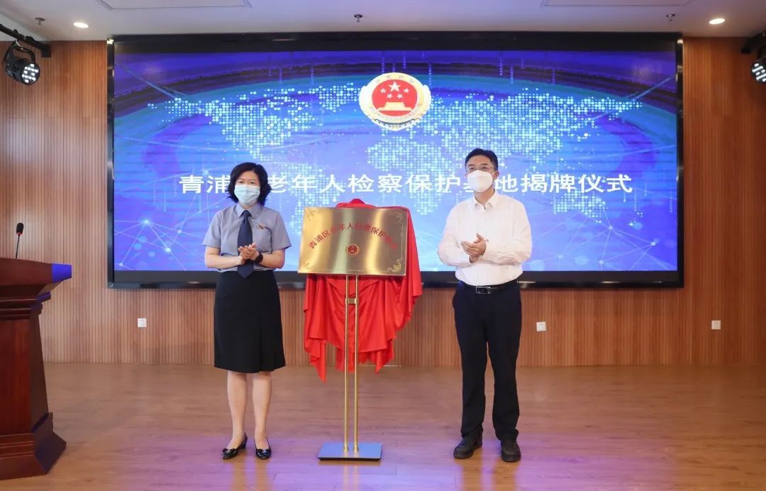 青浦区检察院副检察长柳燕,盈浦街道党工委副书记、办事处主任曹秋龙共同为青浦区老年人检察保护基地揭牌。