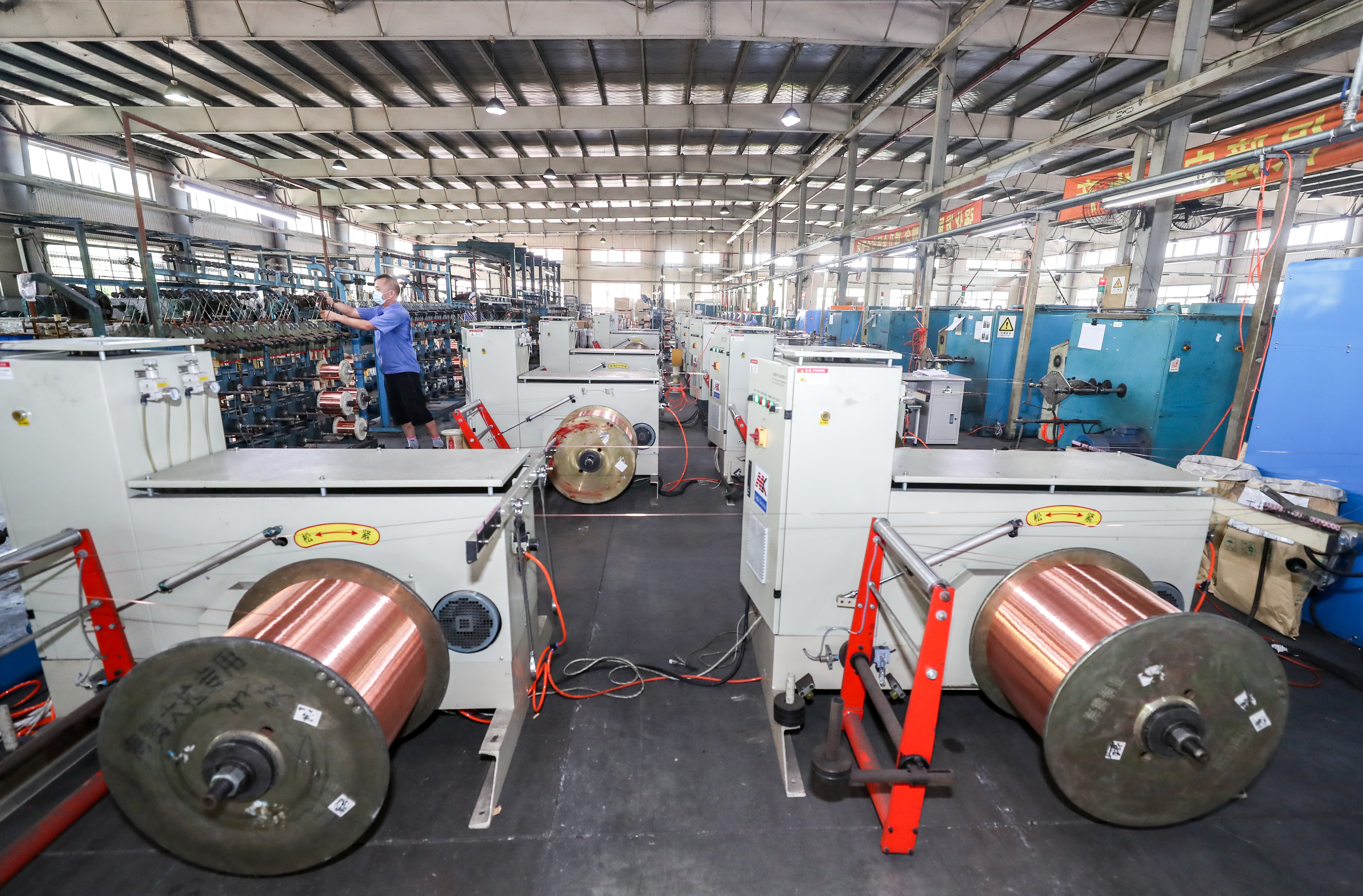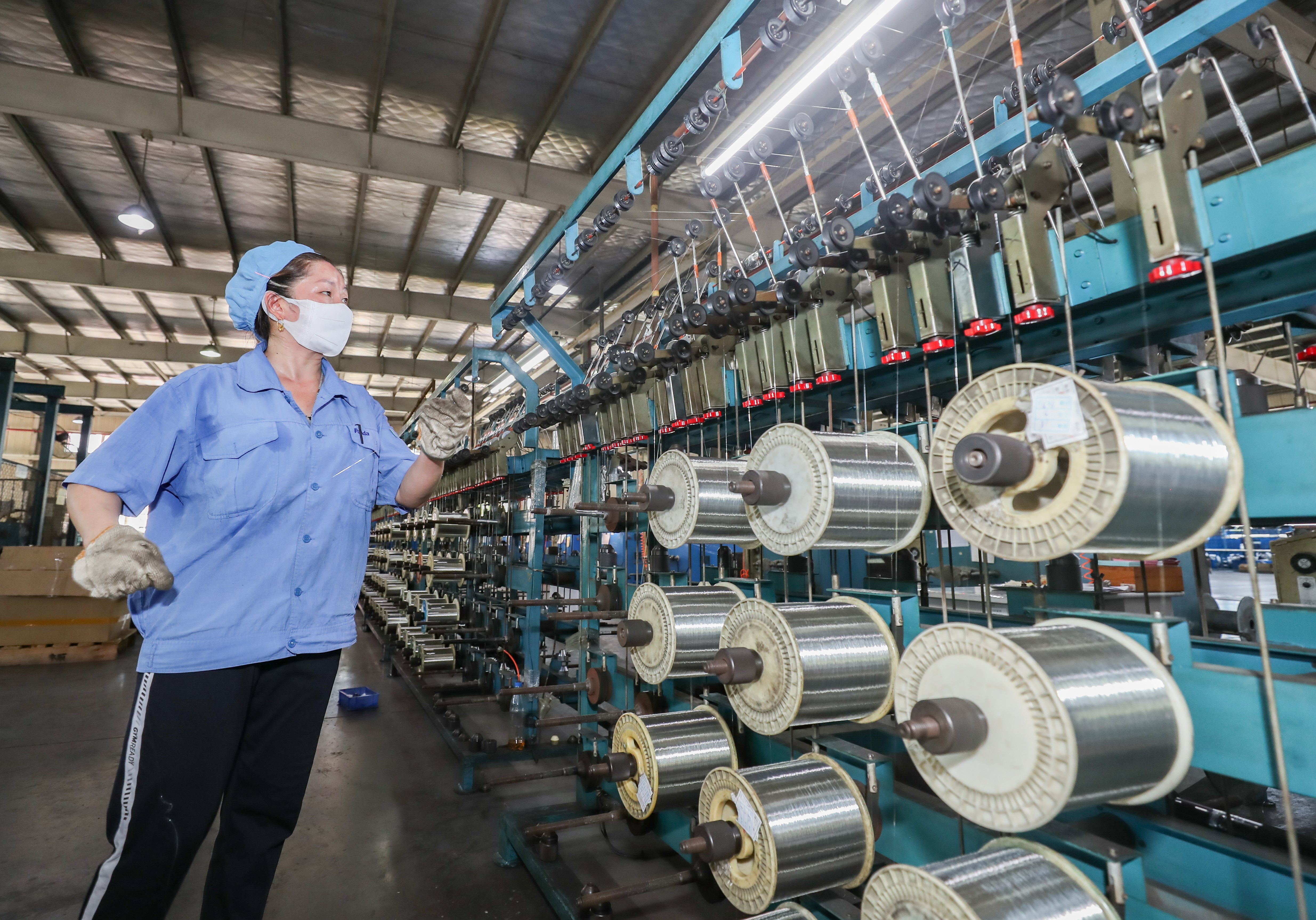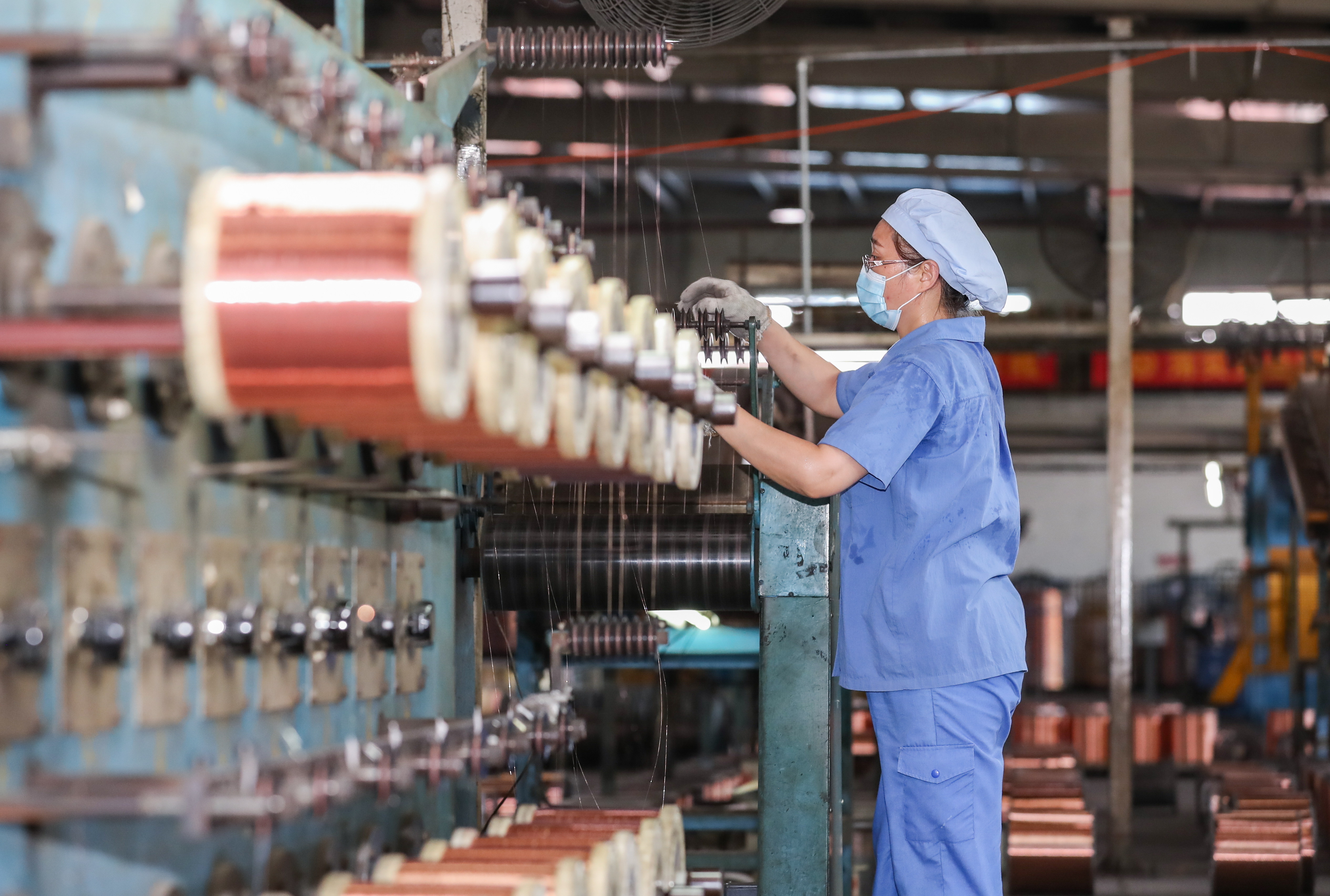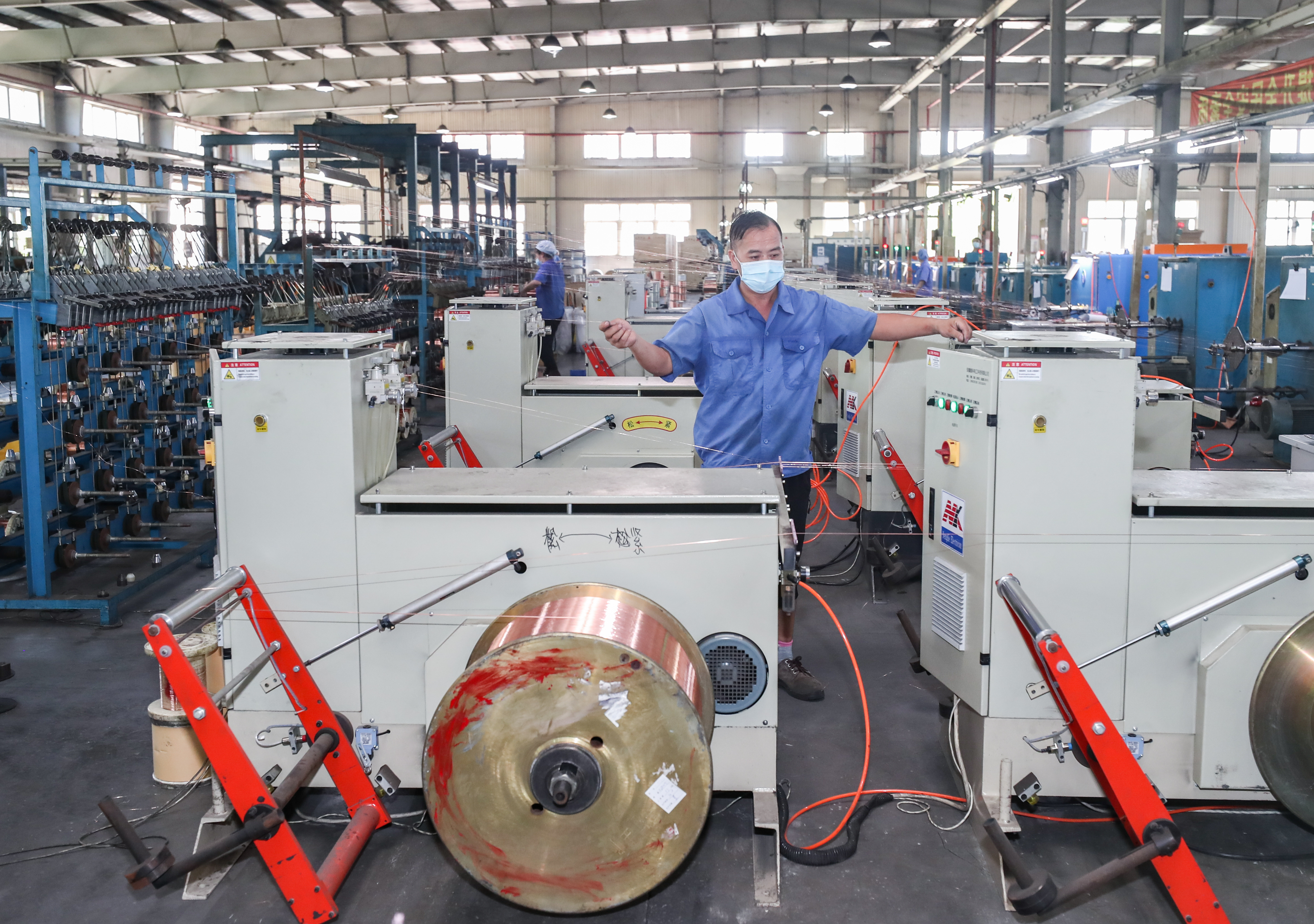 上海市高新技术企业熊猫电线有限公司主营业务为电线、电缆及塑料套管自产自销、加工等,产品运用于汽车航天等高端现代装备线缆、环保智能家居建筑用线、综合功能集成线缆等领域,广泛应用于上海信息化高速公路、浦东国际机场、上海高速铁路、东方明珠、金茂大厦、国际会议中心、上海证券大厦、北京地铁等重大项目。图为生产车间内,工人正在制作线缆。