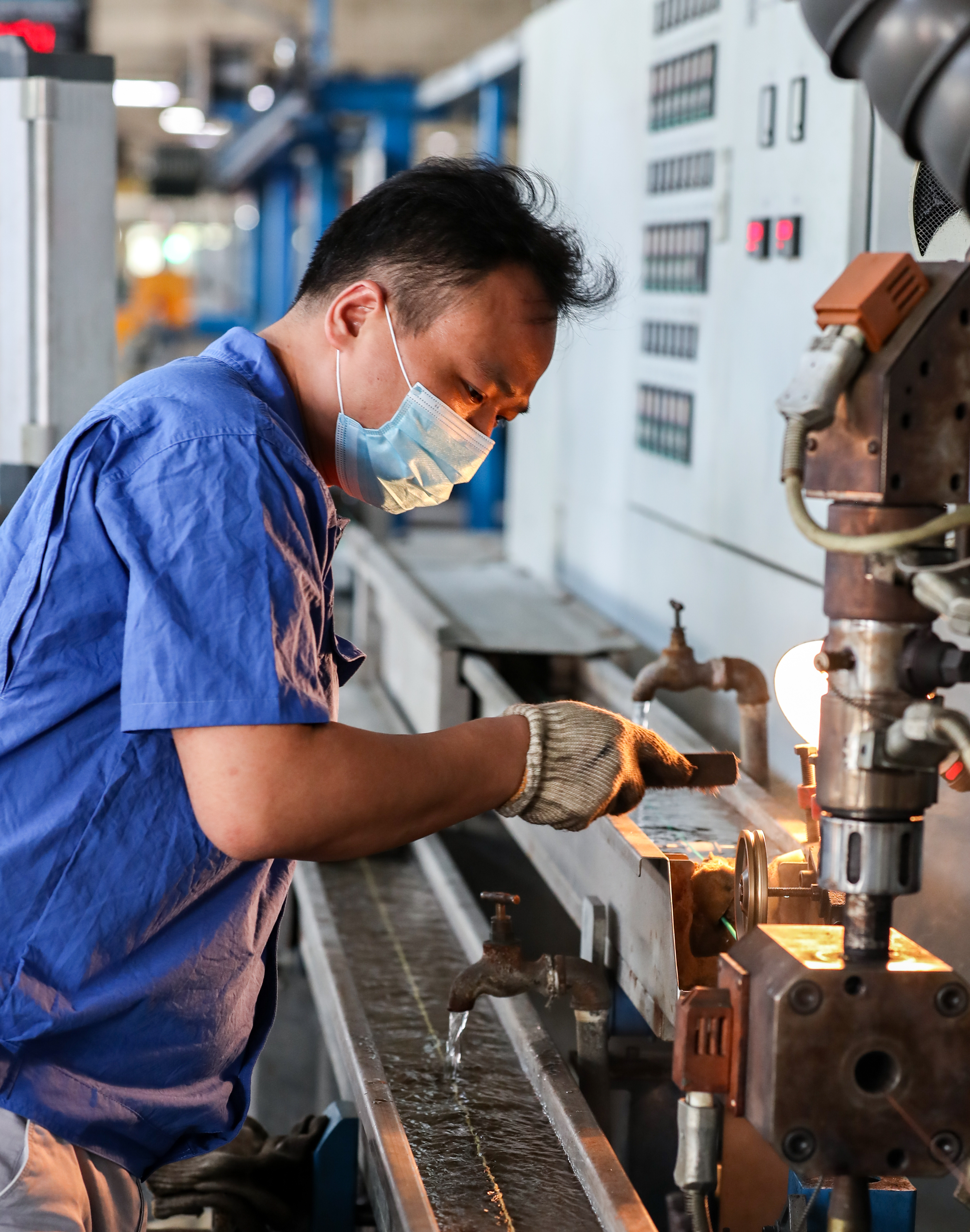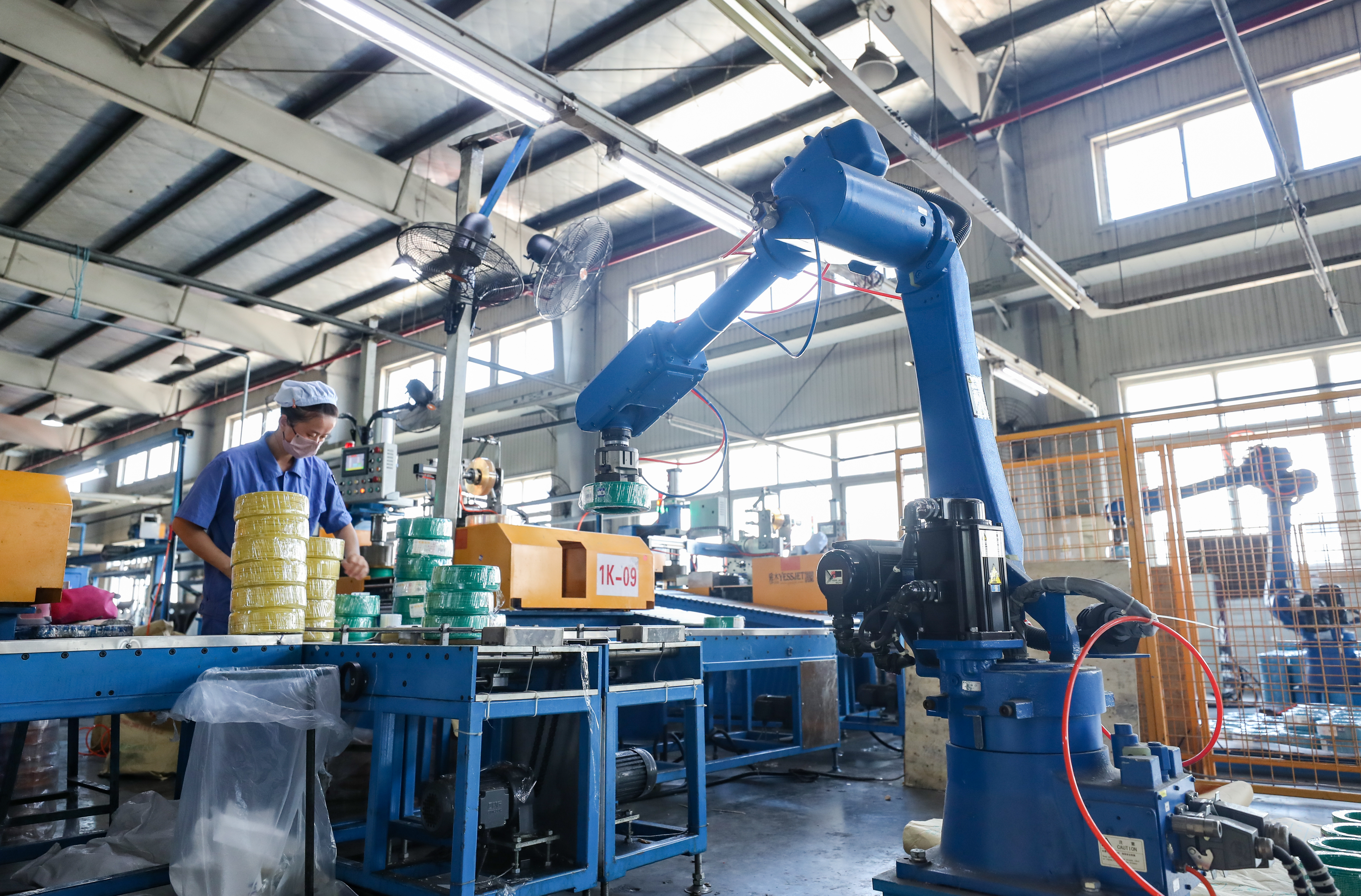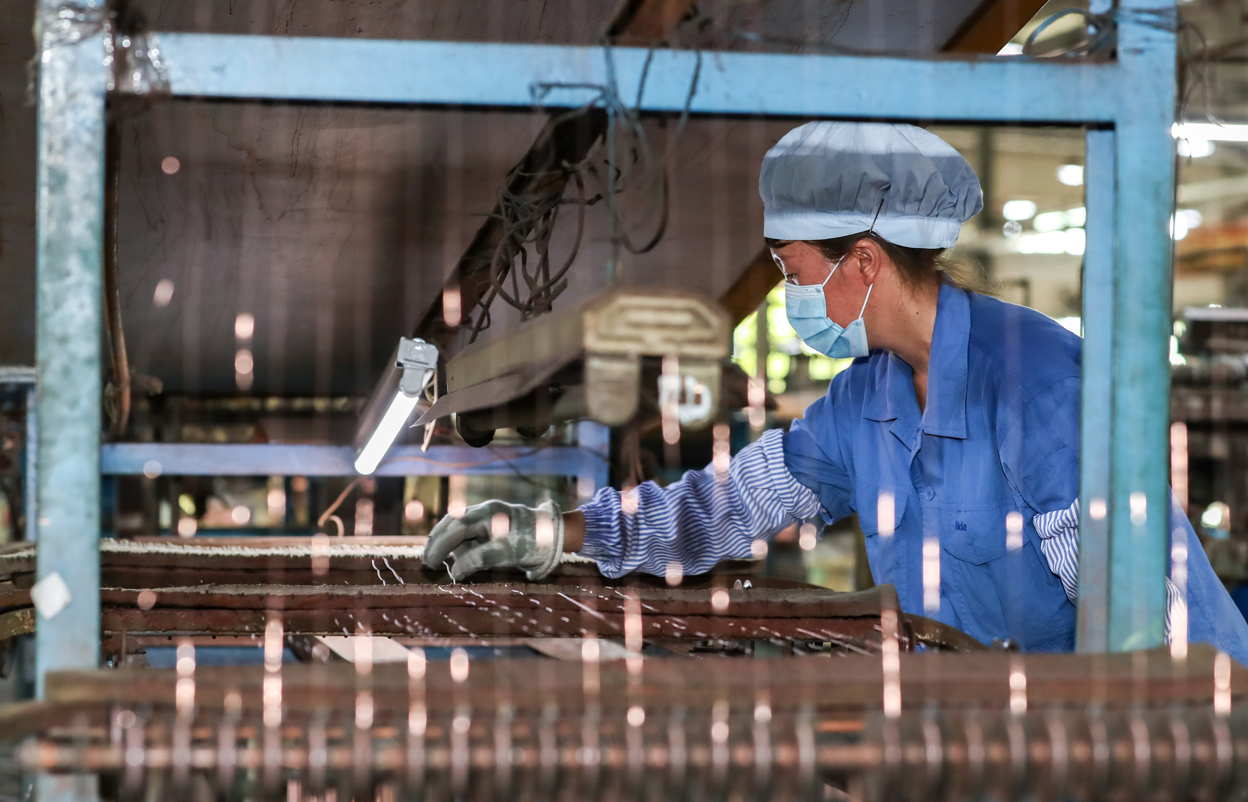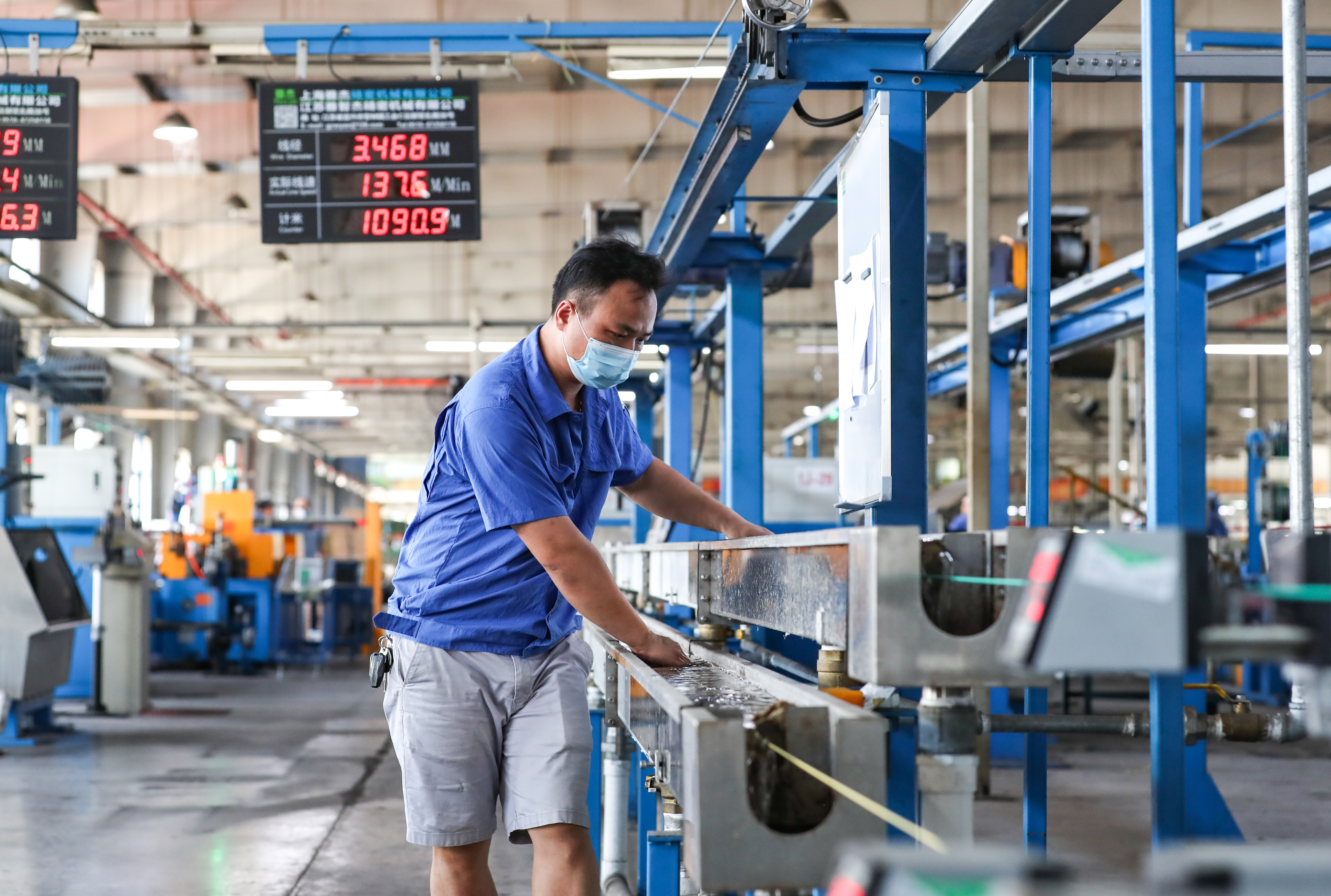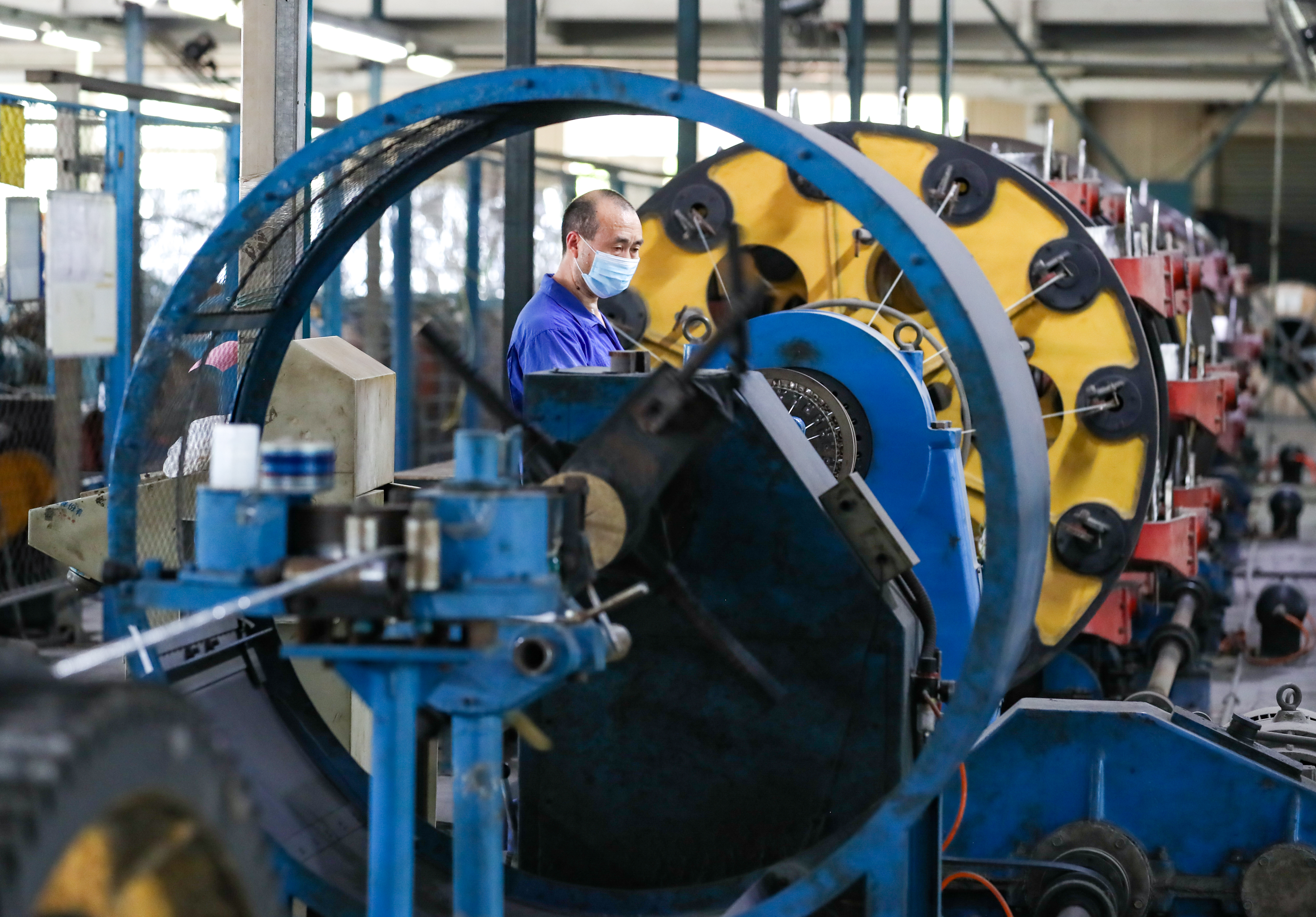 上海市高新技术企业熊猫电线有限公司主营业务为电线、电缆及塑料套管自产自销、加工等,产品运用于汽车航天等高端现代装备线缆、环保智能家居建筑用线、综合功能集成线缆等领域,广泛应用于上海信息化高速公路、浦东国际机场、上海高速铁路、东方明珠、金茂大厦、国际会议中心、上海证券大厦、北京地铁等重大项目。图为生产车间内,工人正在制作线缆。