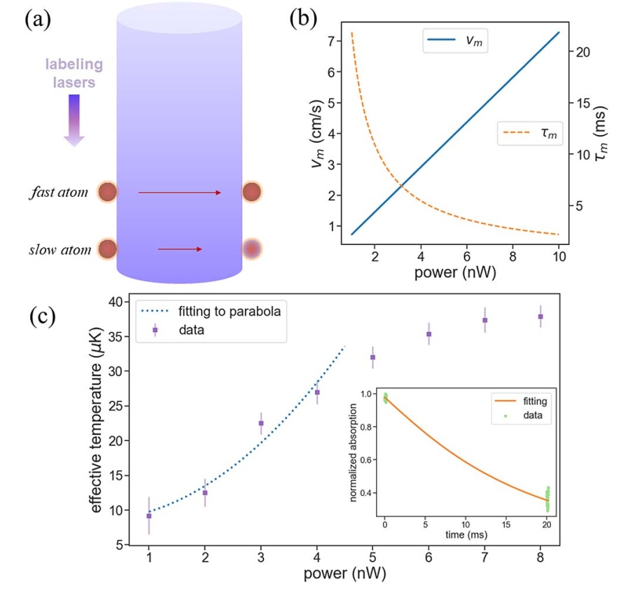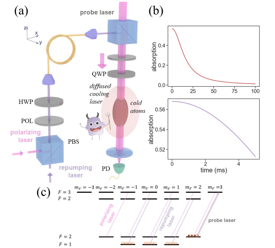 在冷原子量子技术的研究中,通过光学手段进行冷原子热运动相关的探测和操纵是一个重要课题。对于激光冷却后获得的碱金属冷原子气体,研究团队通过针对原子内态的精准标记操作和对原子内态的近似无损连续光脉冲探测,实现了用小于1ms的探测时间对冷原子温度进行确定性测量,并针对三维空间中的两个横向运动自由度从大约20μK的冷原子系综中成功过滤出了温度小于1μK的较冷原子组分。基于实现快速冷原子温度测量的要求,研究团队在抑制探测光振幅和相位噪声的同时,通过桶探测形式的单个探测光脉冲提供的信息以解析原子的扩散动力学。进而,当扩散时间持续到几十毫秒时,即当原子的速度差转化为较为显著的位置差时,较冷原子组分的分离也是可以实现的。此外,与位置相关的标记过程可以进一步改进为与速度相关的标记过程,基于这一转变,研究团队在冷原子系综中开展了模拟麦克斯韦妖模型的实验并研讨了相关过程中熵的产生与流向。