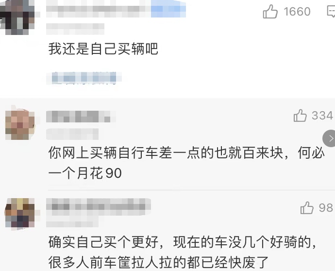 很多共享单车用户表示,目前共享单车价格越来越贵,路面上的车却越来越旧;还有用户认为共享单车的服务和车辆维护水平并没有随价格一起提高;也有人说,这个价钱不如自己买辆自行车……