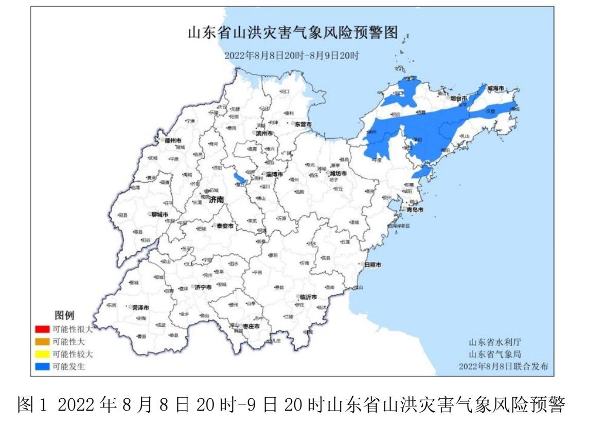 山东省水利厅和山东省气象局8月8日联合发布山洪灾害气象预警:预计8月8日20时至8月9日20时,济南、烟台、青岛、威海等市局部地区可能发生山洪灾害(蓝色预警)。