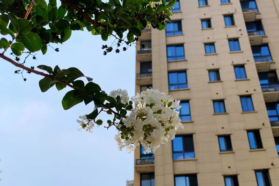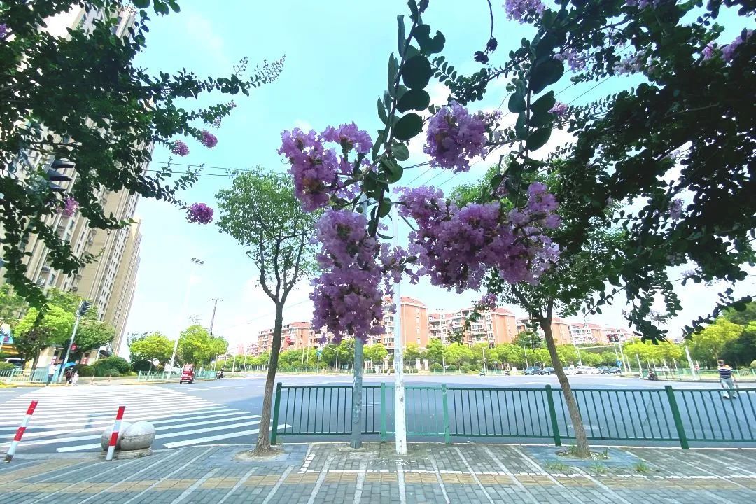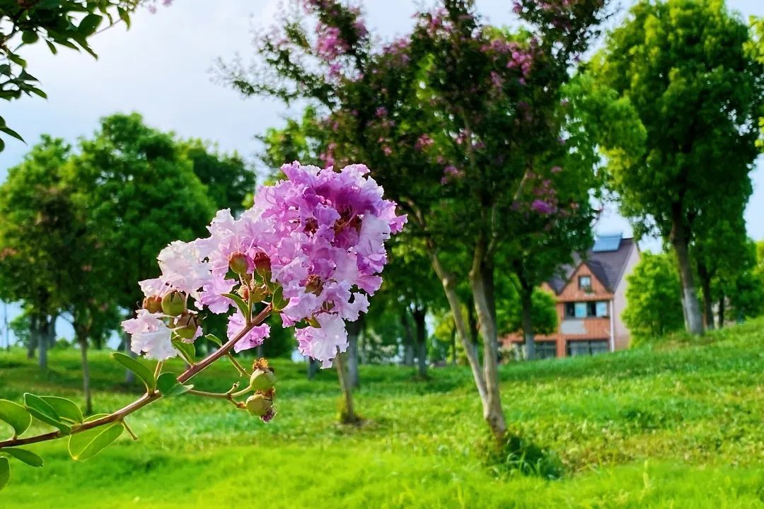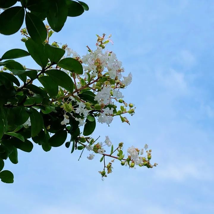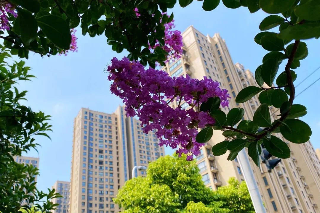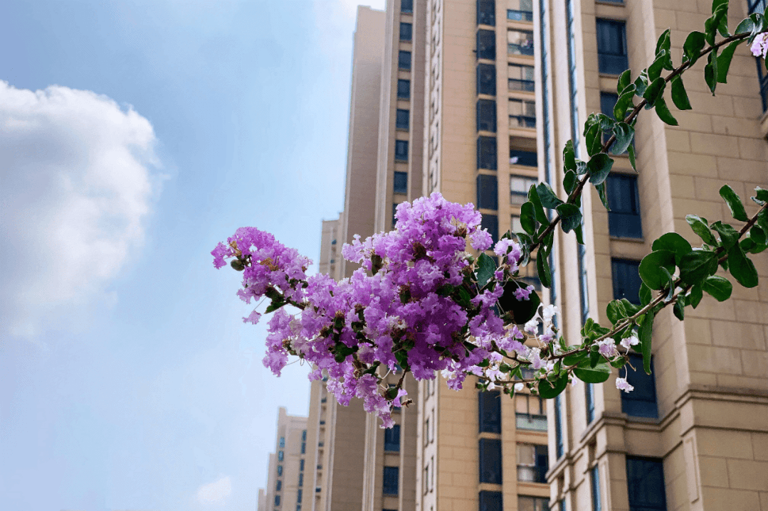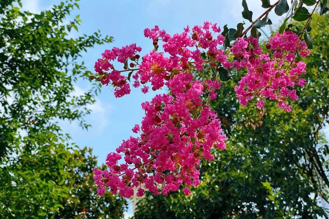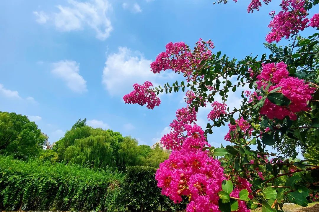 紫薇,花色丰富艳丽,花朵繁密而高雅。每年的花期长达数月,花期极长,由6月可开至9月,故有“百日红”之称。宋代杨万里有首诗“谁道花红无百日,紫薇长放半年花”,讲的就是紫薇的花期。