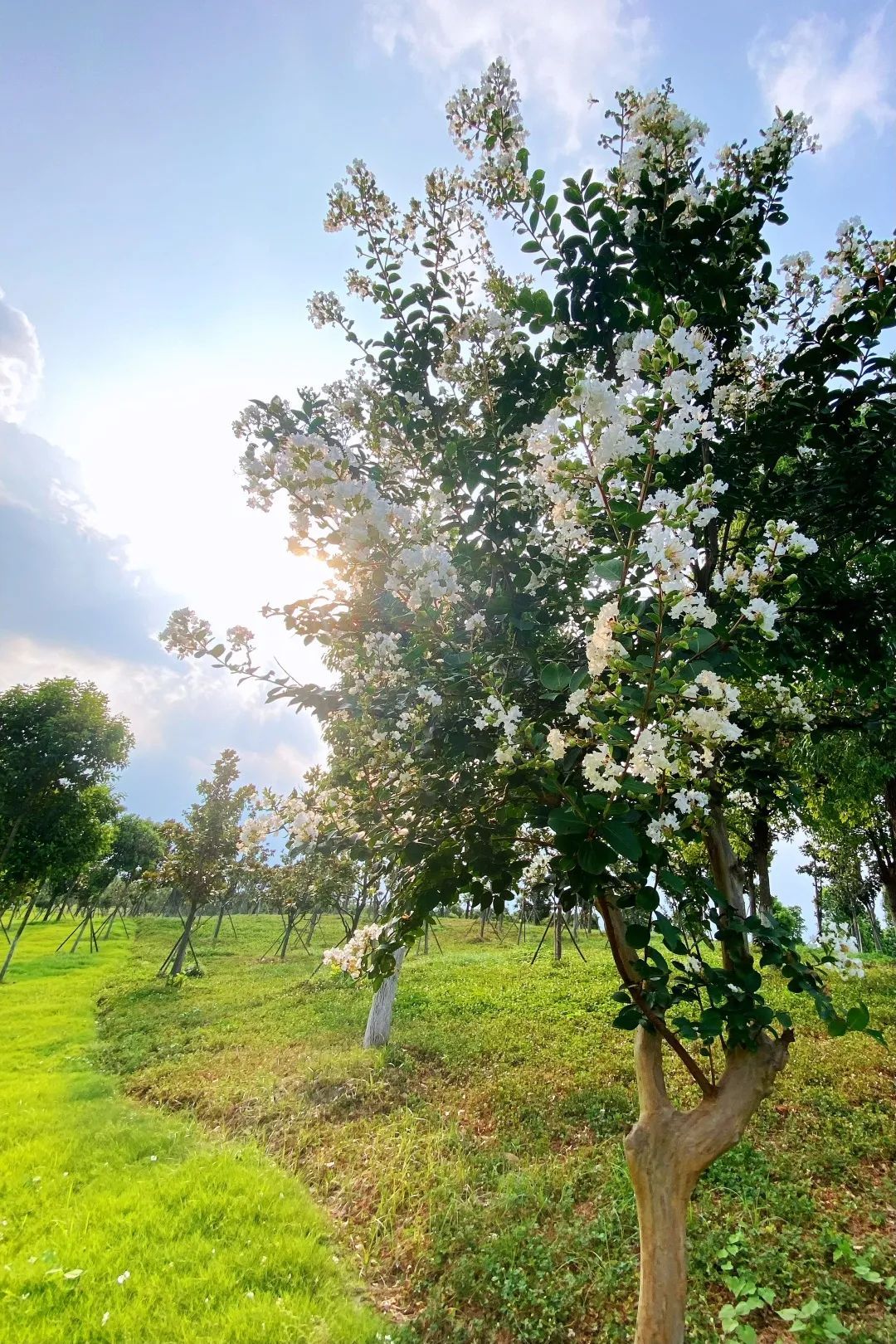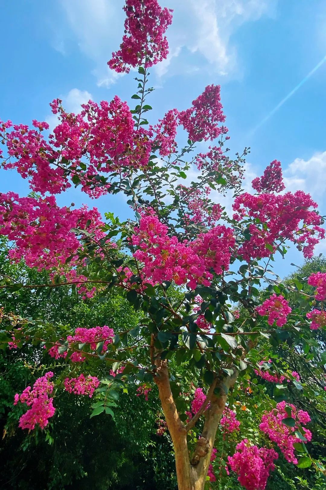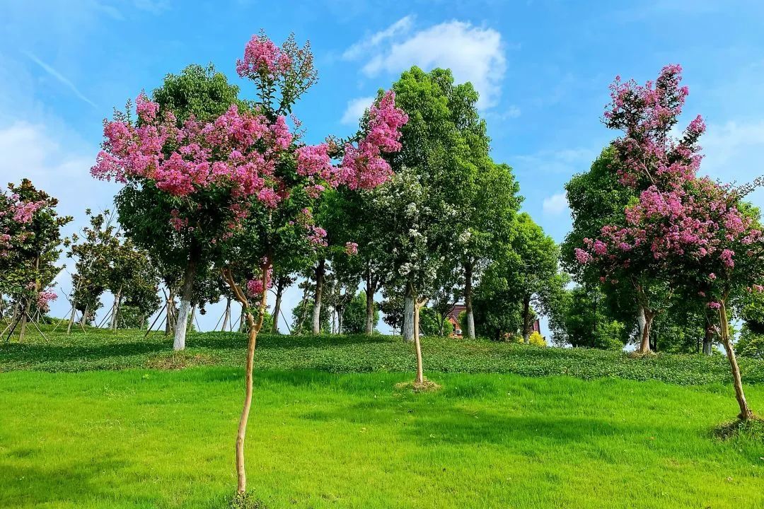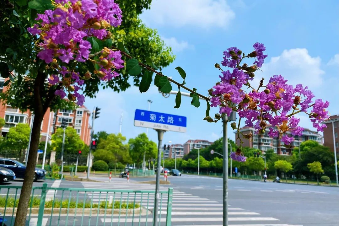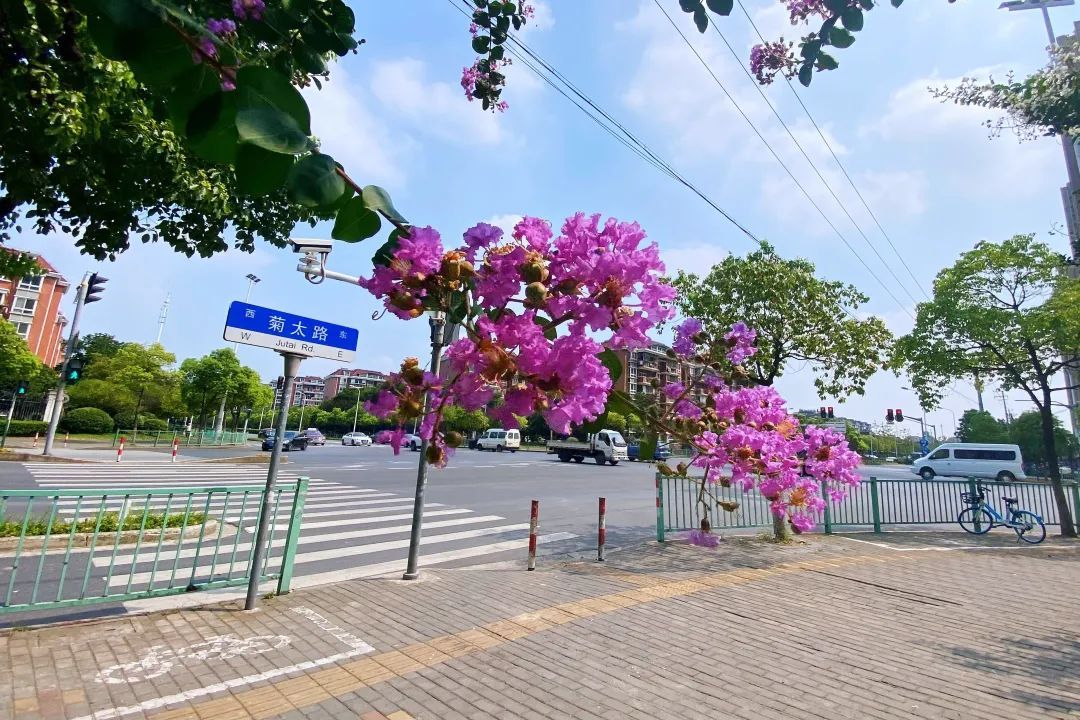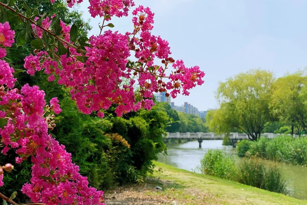 紫薇,花色丰富艳丽,花朵繁密而高雅。每年的花期长达数月,花期极长,由6月可开至9月,故有“百日红”之称。宋代杨万里有首诗“谁道花红无百日,紫薇长放半年花”,讲的就是紫薇的花期。