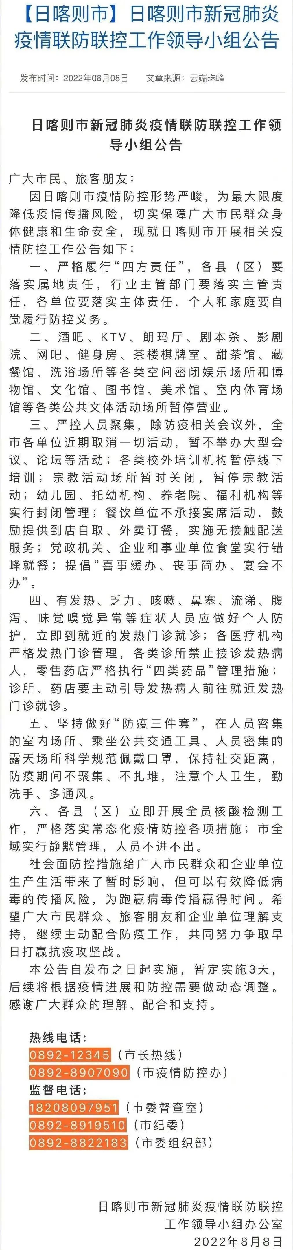 西藏日喀则市新冠肺炎疫情联防联控工作领导小组8日发布公告,日喀则市全域实行静默管理,人员不进不出。公告自发布之日起实施,暂定实施3天。