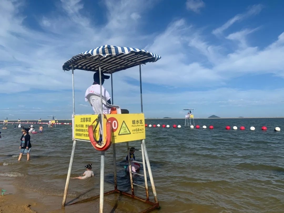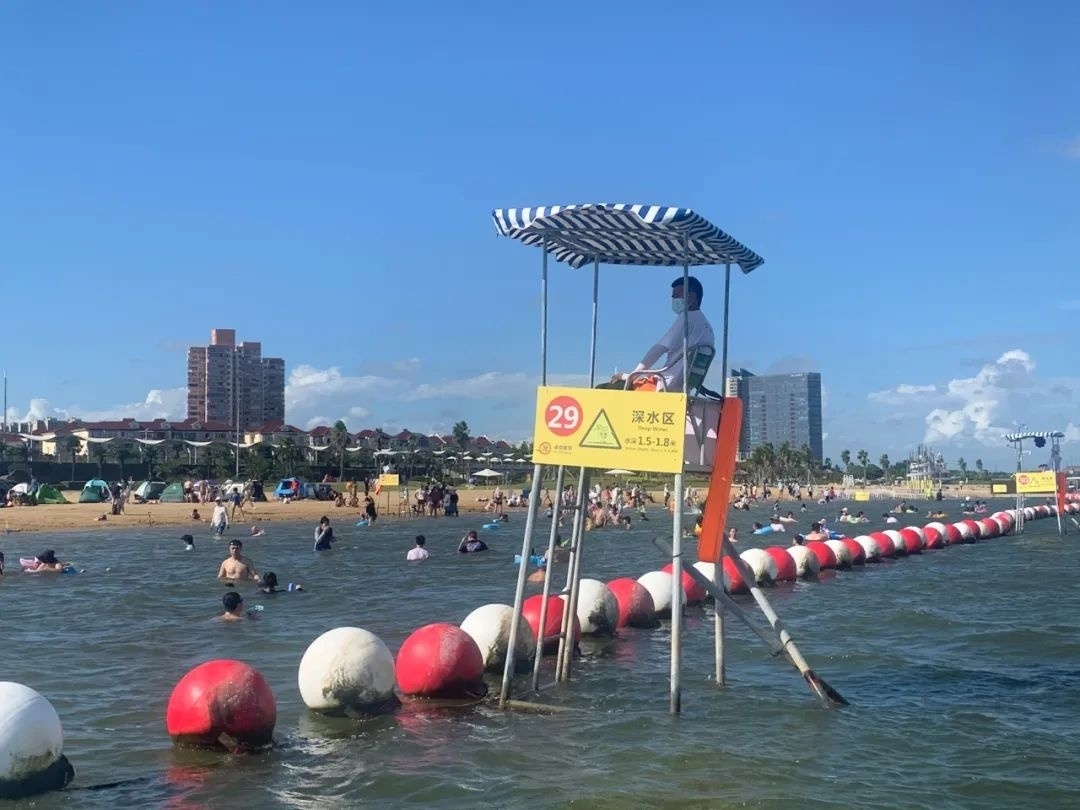 记者了解到,自夏季泳期开启,每天的早上八点半到晚上九点半之间,只要有游客在泳区内,就有救生员时刻坚守在岗位上,保障游客的安全。