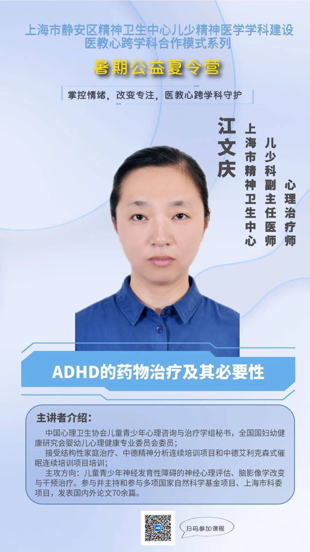 作为静安区精神卫生中心儿少精神医学学科建设医教心跨学科合作模式系列活动,8月9日晚,暑期公益夏令营第四场讲座将特邀上海市精神卫生中心儿少科的江文庆副主任医师带来《ADHD的药物治疗及其必要性》的分享,从儿少精神医学的角度为大家讲解ADHD重要治疗方式之一的药物治疗及其重要意义。