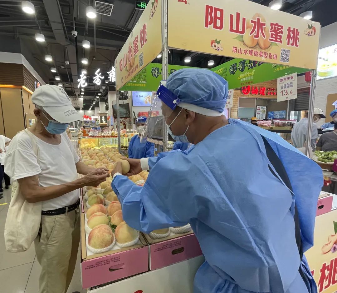 记者来到徐汇市民最常逛的天钥桥路上汇联商厦里的一家水果专柜,经营了二十多年的无锡阳山水蜜桃专柜店长周兴荣正在教老顾客们如何挑选品质上乘的水蜜桃,从果大、味美、颜色好看等方面进行观察,现场他还为顾客演示正确吃水蜜桃的方式。
