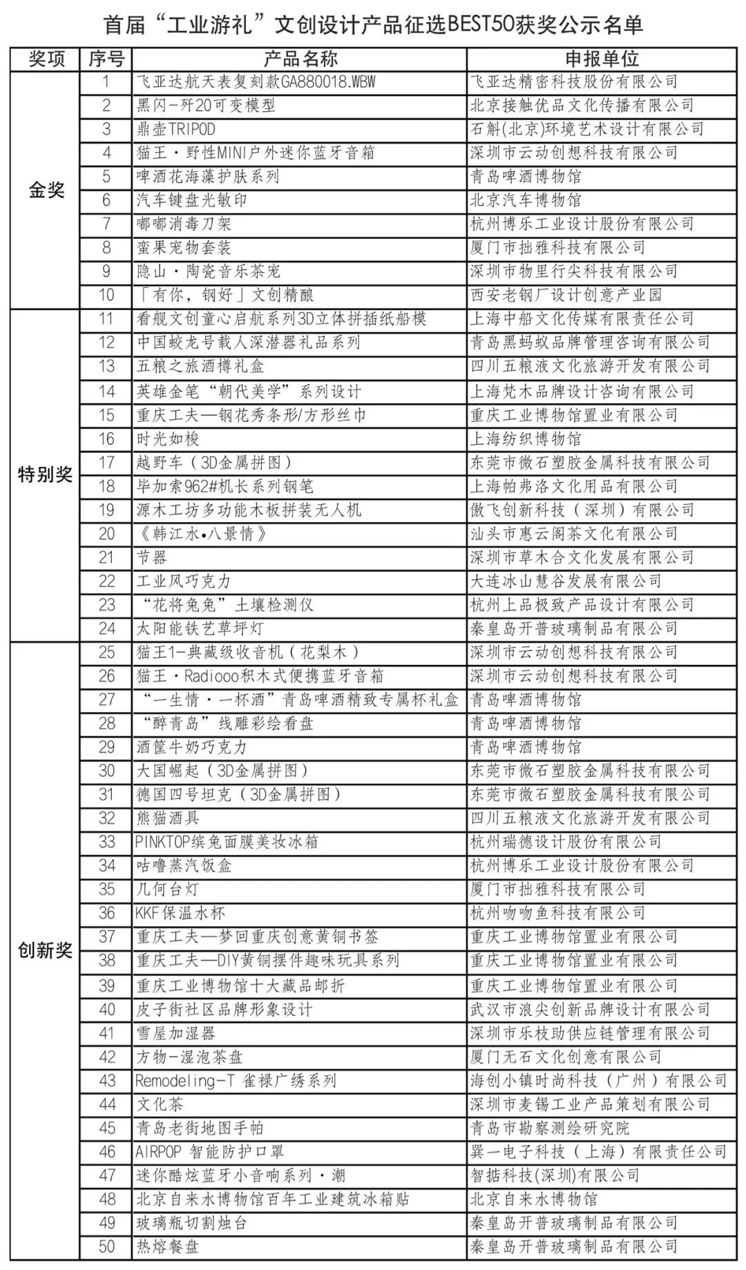 此次评选邀请了中国旅游协会旅游商品与装备分会副会长陈斌、小米有品科技有限公司工业设计总监黄苏雁、北京故宫文化发展有限公司总经理陈非三位专家,从工业文化特色、功能性、情感性、市场性、艺术性、环保性等方面逐一评审,最终评出金奖10名,特别奖14名,创新奖26名。