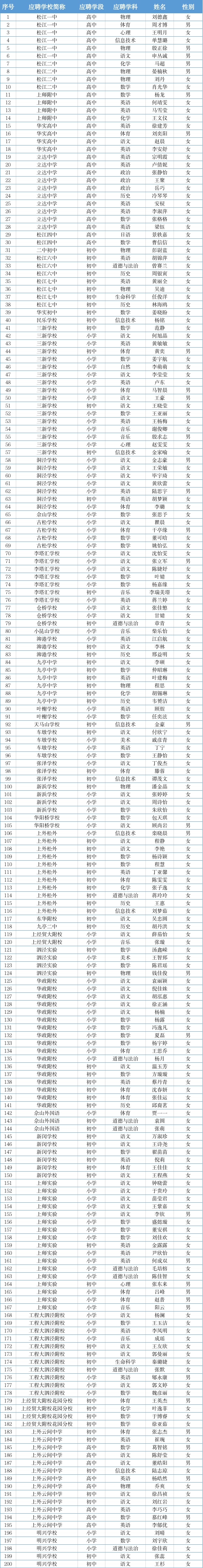 根据《上海市人力资源和社会保障局关于印发<上海市事业单位公开招聘人员暂行办法>的通知》(沪人社专发〔2009〕45号)文件精神及松江区教育局下属事业单位教师招聘工作的相关要求,经笔试、面试、心理测试、政审、体检等程序,现对2022年松江区教育局下属事业单位第二批教师招聘拟录用人员进行公示。如对公示对象有异议,请在公示期间及时反映。