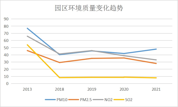通过节能减排、产业转型、生态建设等工作开展,园区环境质量持续改善,各项环境指标向好。道路扬尘数据从最高0.104毫克/立方米降低到0.076毫克/立方米,河道水质改善达到了III类标准,持续稳定达标,环境空气质量逐年向好,主要指标降幅30%-80%左右。环境质量的改善既提升了区域环境面貌、品质形象,也为园区产业发展释放环境容量。
