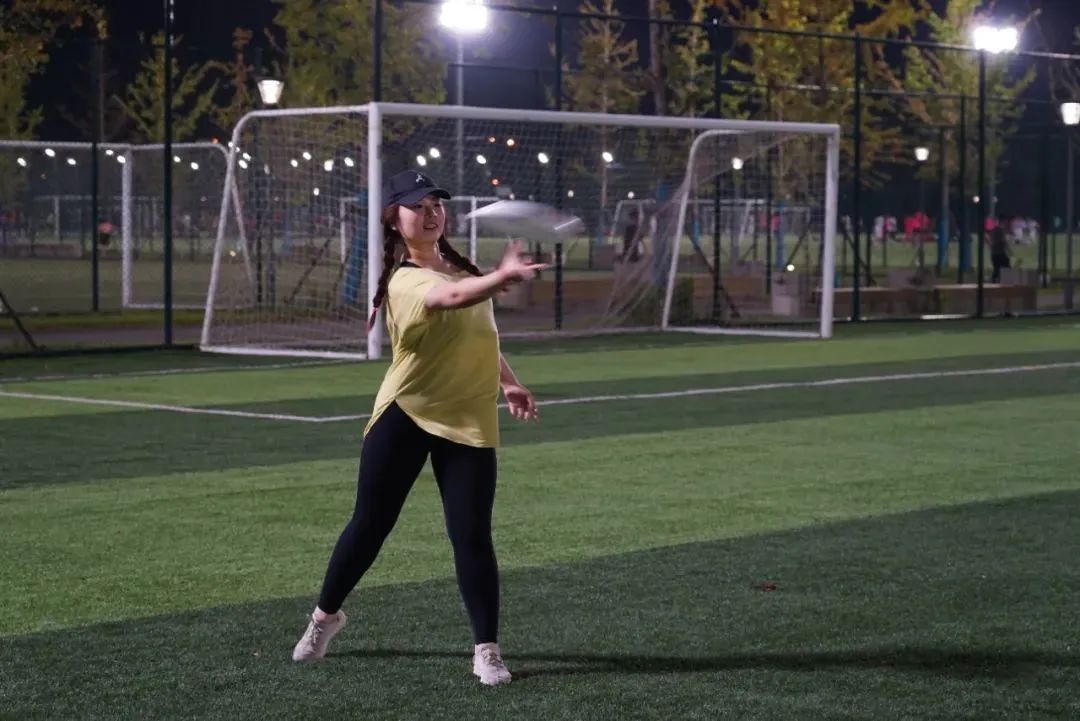 “盘、手腕、手臂在一个角度上,跟你出盘的角度是有关系的。”晚上7点,在市民体育公园的飞盘体验场上,前来体验的市民在教练的指导下,正学习如何正确握盘,以及抛掷飞盘的技巧。热身完毕后,大家两两一组,在绿茵场上抛出一道道弧线。