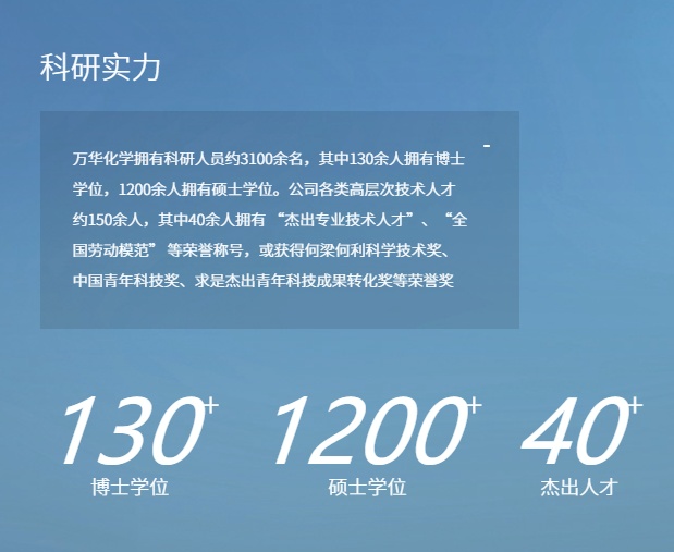 据了解,万华现有国内外人才数量超过两万人,本硕博8500多人,专职研发人员3800多人,集聚了一批国内外知名专家。“万华有个以有激情、有思想、有胸怀、有韧劲、有担当、有业绩这‘六有’为关键词的人才画像。”廖增太提到,身处化学行业,在不少人仍“谈化色变”、有些企业甚至把名称里的“化学”两个字去掉的情况下,万华首先是以对于“化学让生活更美好”这份事业强烈的使命感和责任感去感召人才,实现以真情聚集人才。