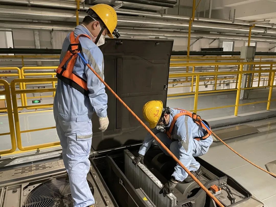 在轨交17号线徐泾基地,车库内列车依次停靠,这里虽然见不到太阳,但是体感上仍然十分闷热。为了使列车空调能够在高温天气下平稳运行,给乘客提供清凉的出行环境,车辆检修人员需要对列车空调定期进行清洁和检查,这对于处在闷热车顶上的检修人员来说,可谓是一项巨大的“烤验”。走近一列正在检修的车辆,身穿蓝色工服、头戴安全帽、腰挂安全带的检修人员正弯着腰专注地工作着,打开空调盖板,熟练地把沾着灰尘的脏滤网从空调盖板内取出,换上崭新的滤网。工作中,检修人员还需要对空调机组的压缩机、冷凝风机等设备、零件进行仔细检查,排查是否有异常情况。这样的动作不断重复着,衣服也被汗水浸透,可他们却无暇顾及这些。