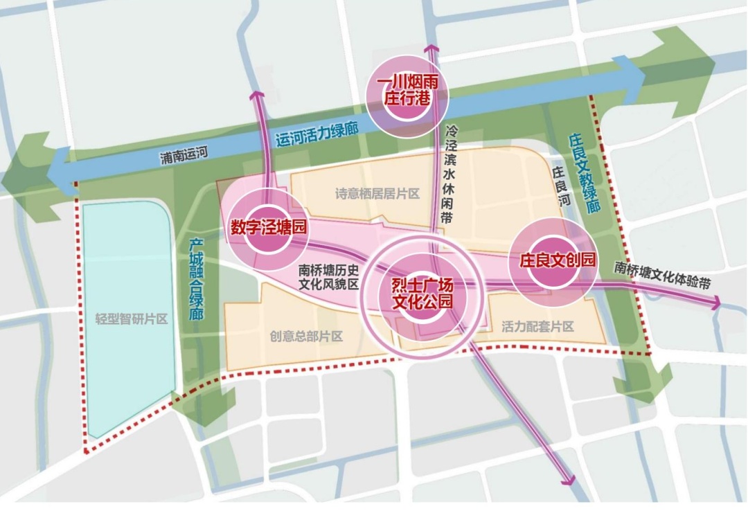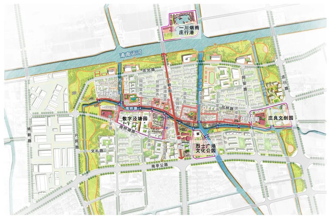 一川烟雨庄行港:融入东方美谷产业生态,结合港口形成水上新经济枢纽,建设“延续历史文化脉络,顺应时代数字经济”的活力节点,打造成为浦南运河水上经济带的西部中心,冷江雨巷的北部门户,实现对千年古镇庄行的活化。