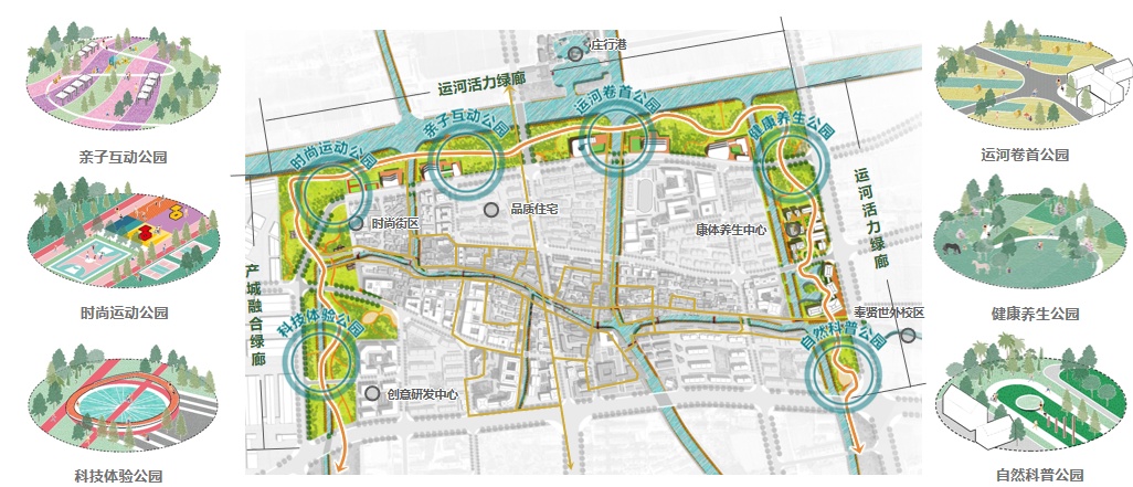 环形绿廊:提炼生态资源,利用公共绿地,植入户外交流、运河文化展示、时尚运动等休闲功能,打造环冷江雨巷生态绿廊。拟打造六大主题公园,包括科技体验公园、时尚运动公园、亲子互动公园、运河卷首公园、健康养生公园、自然科普公园,丰富市民朋友的休闲娱乐生活。