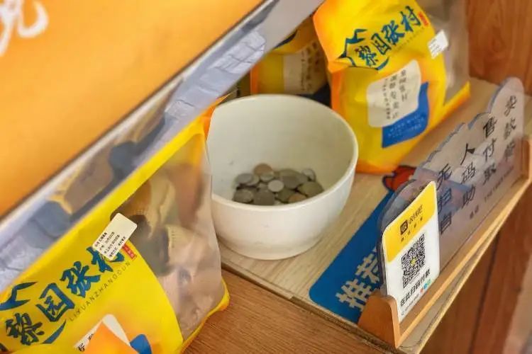 在小店门口的桌子上,一个装着硬币的盒子,以及贴在盒子上的二维码,组成了这家店收银体系。平日里,顾客们自行用硬币找零、有二维码付账。为了方便不习惯的客人,小郜在“无人售卖、付钱自取”的打印纸下方,留了一串自己的电话号码。